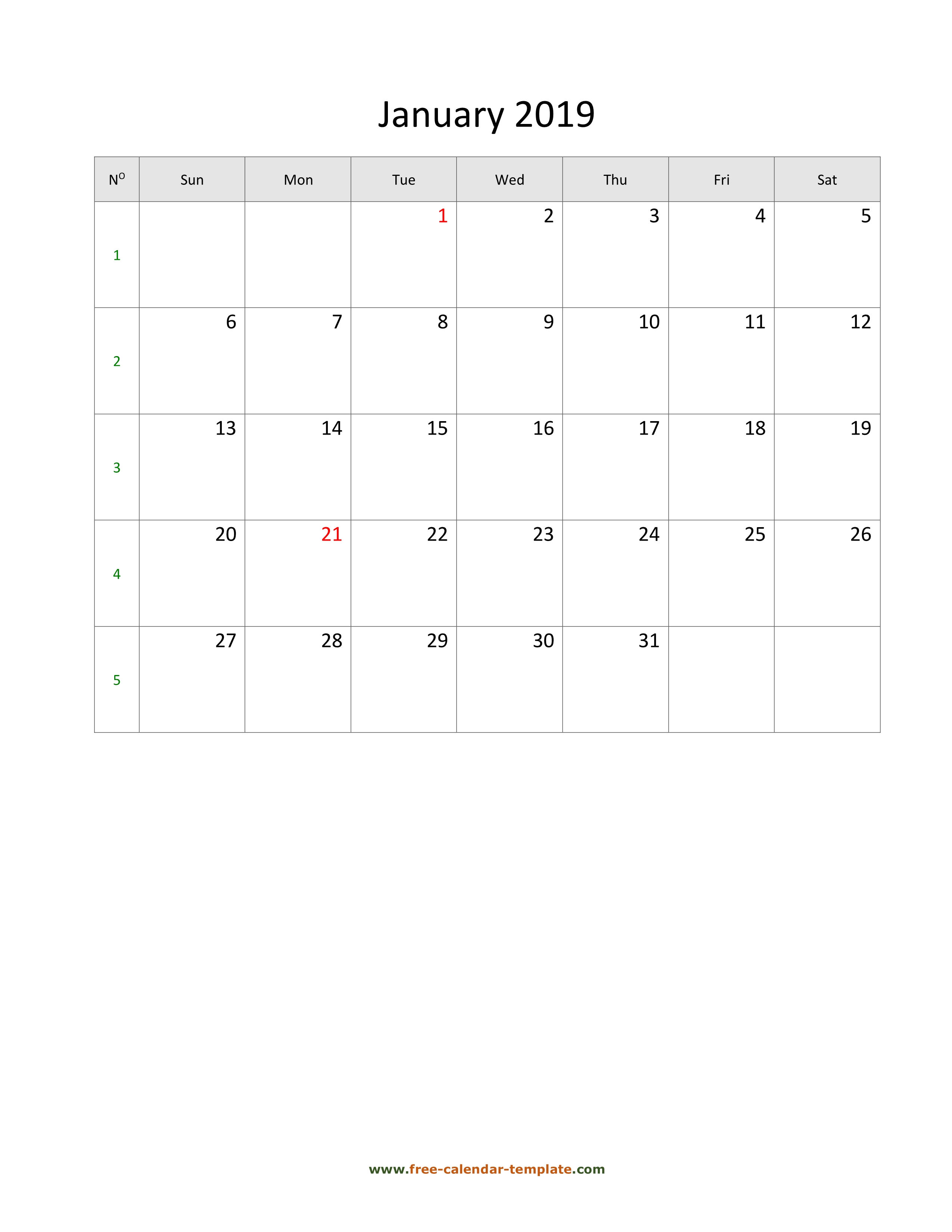 Monthly Calendar 2019 simple design with large box on each day for notes, holidays on red. Monthly Calendar 2019 simple blank template, week starts on Sunday, US letter format (vertical/portrait layout), 12 pages for 12 months calendar. Download as DOCX (MS Word), PDF (Adobe Reader PDF) and JPG, edit, add own events, notes, appointments and print.
