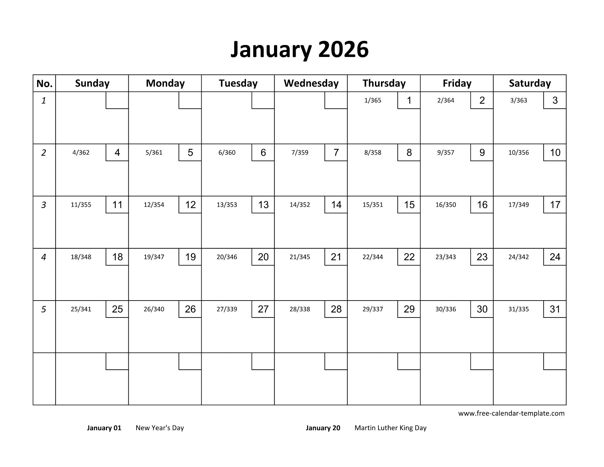 Monthly Calendar 2026 grid lines for holidays and notes (horizontal)