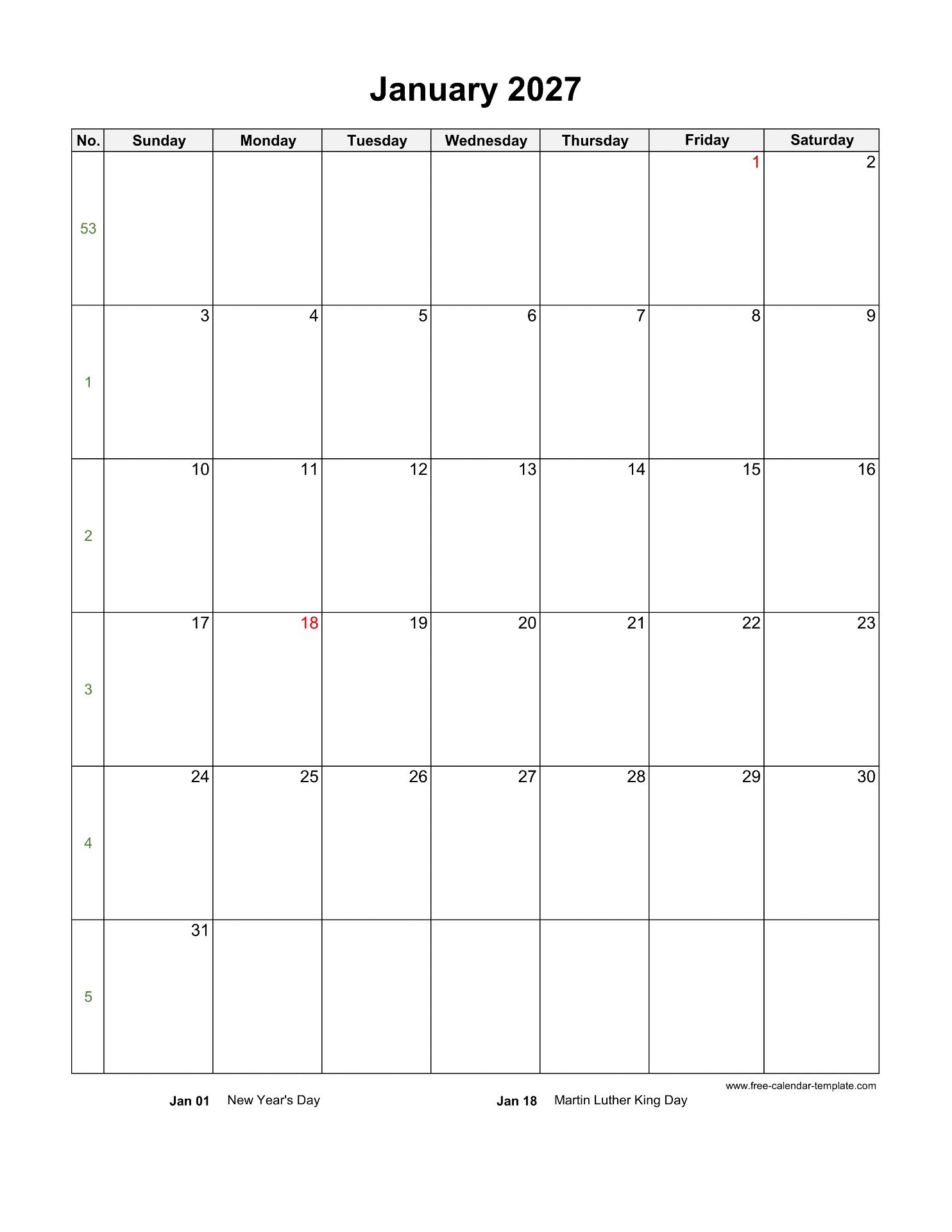 Free 2027 Monthly Calendar Blank Vertical Template including us federal holidays, week numbers, large box for notes. Free 2027 Blank Calendar, weeks starting with Sunday, US letter format (vertical/portrait layout), 12 pages, one month per page. Download as DOCX (MS Word), PDF (Adobe Reader PDF) and JPG, editable and printable.