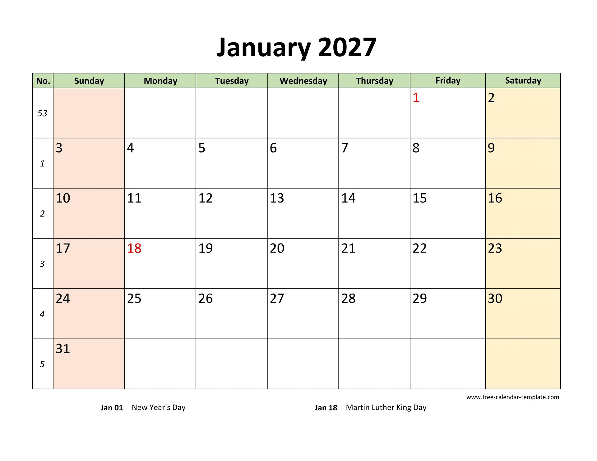 Monthly 2027 Calendar Printable with coloring on weekend, large box on each day for notes. Free Monthly 2027 Calendar Printable, week starts on Sunday, US letter format (horizontal layout), one month per page, 12 pages. Available in DOCX (MS Word), PDF (Adobe Reader PDF) and JPG. Free download and print, non-commercial use only.