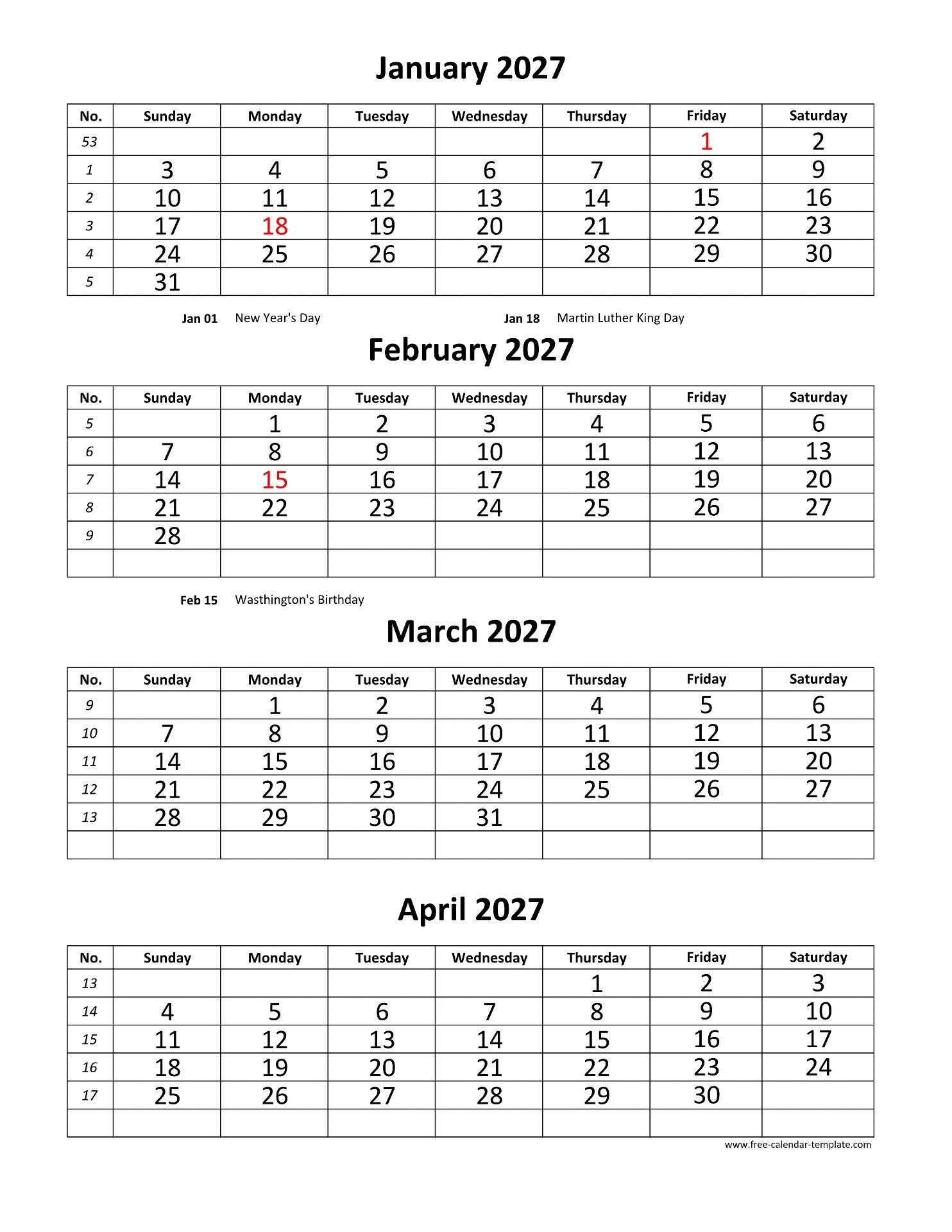 Monthly 2027 calendar 4 months