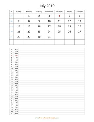 July Calendar 2019 Printable with checkboxes for each day. Free July Calendar 2019 Printable, week starts on Sunday, US letter format (horizontal layout), one month per page. The available file formats are DOCX (MS Word), PDF (Adobe Reader PDF) and JPG. Free download and print.