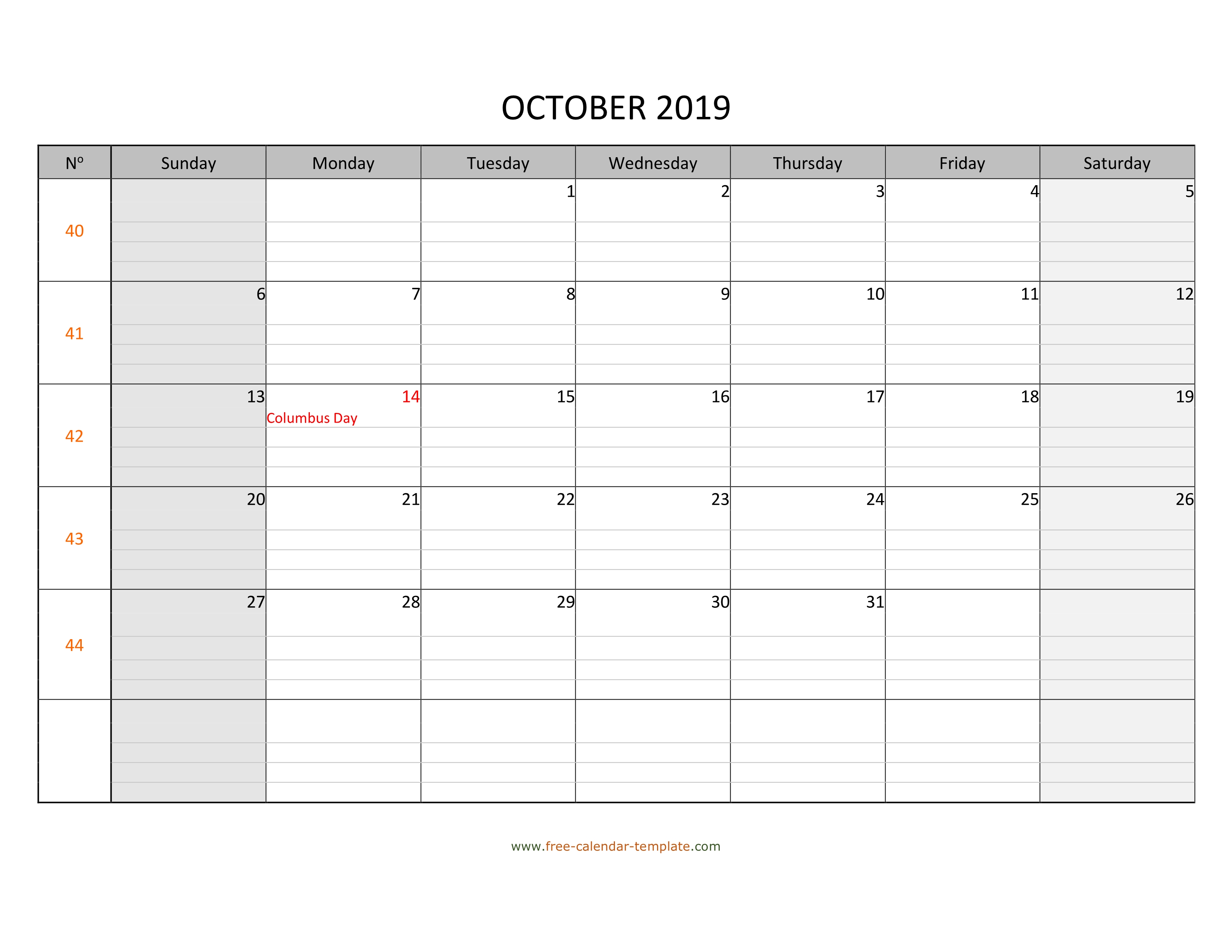 October 2019 Calendar Free Printable with week numbers, federal holidays, grid lines designed, Saturday and Sundays are marked with grey background color. October 2019 Calendar, week starts on Sunday, US letter format (horizontal/landscape layout), 12 months on 12 pages. Available in DOCX (MS Word), PDF (Adobe Reader PDF) and JPG. Free download and print.