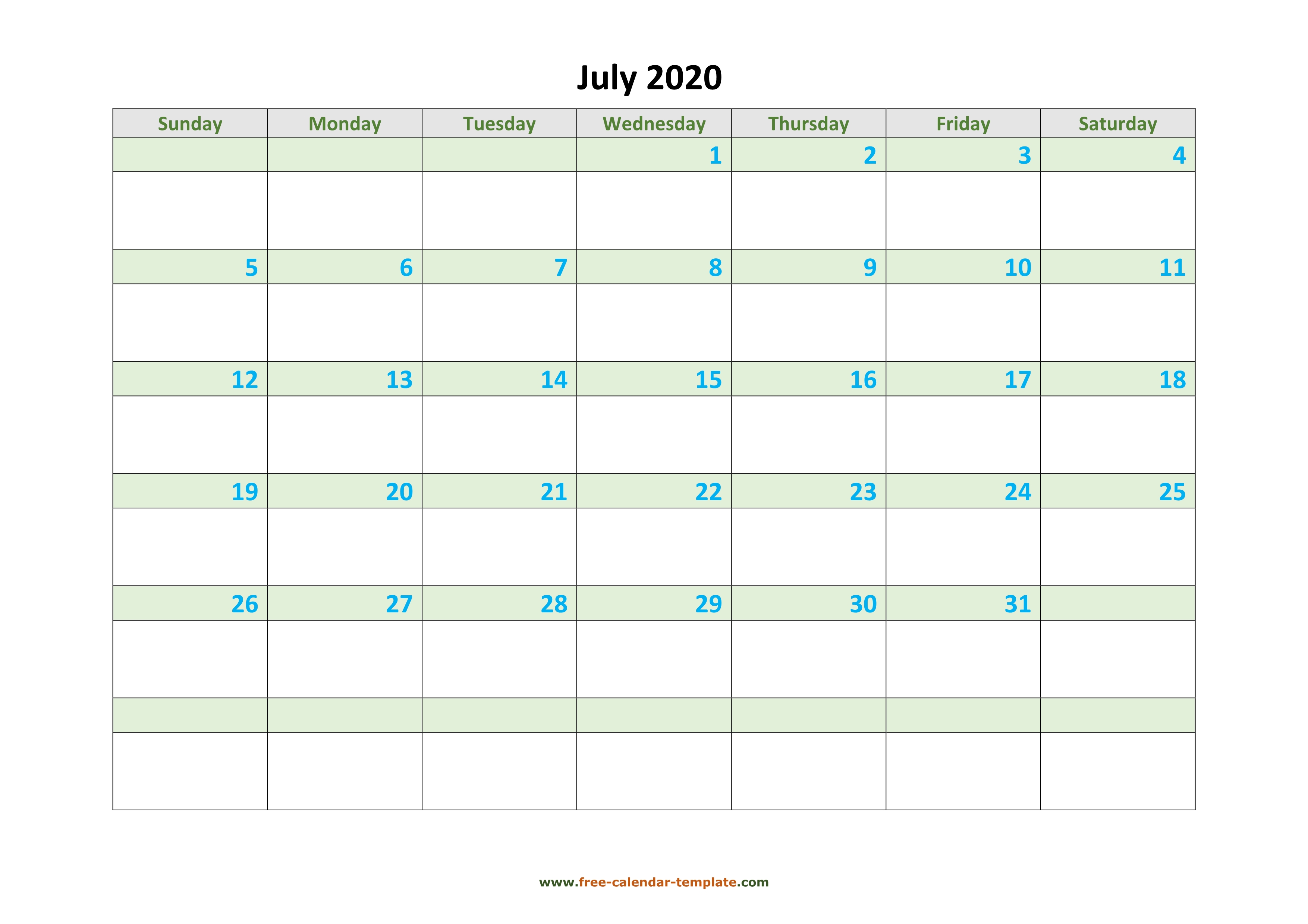 July 2020 Calendar Free Printable with grid lines designed (horizontal)