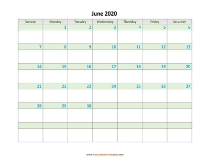Free 2020 June Calendar Blank Vertical Template including us federal holidays, week numbers, large box for notes. Free 2020 Blank Calendar, weeks starting with Sunday, US letter format (vertical/portrait layout), 12 pages, one month per page. Download as DOCX (MS Word), PDF (Adobe Reader PDF) and JPG, editable and printable.