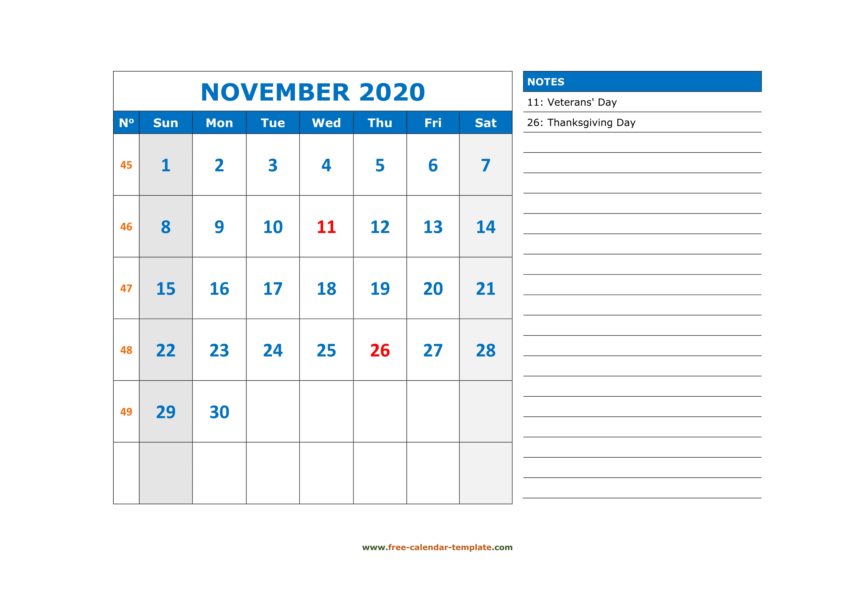 November Calendar 2020 with grid lines for holidays and notes, including week numbers, holidays on red and listed on the right. Free November Calendar 2020, weeks starting with Sunday, US letter format (horizontal layout), one month calendar printed on each page. The available file formats are DOCX (MS Word), PDF (Adobe Reader PDF) and JPG. Free download and print at home or at work.