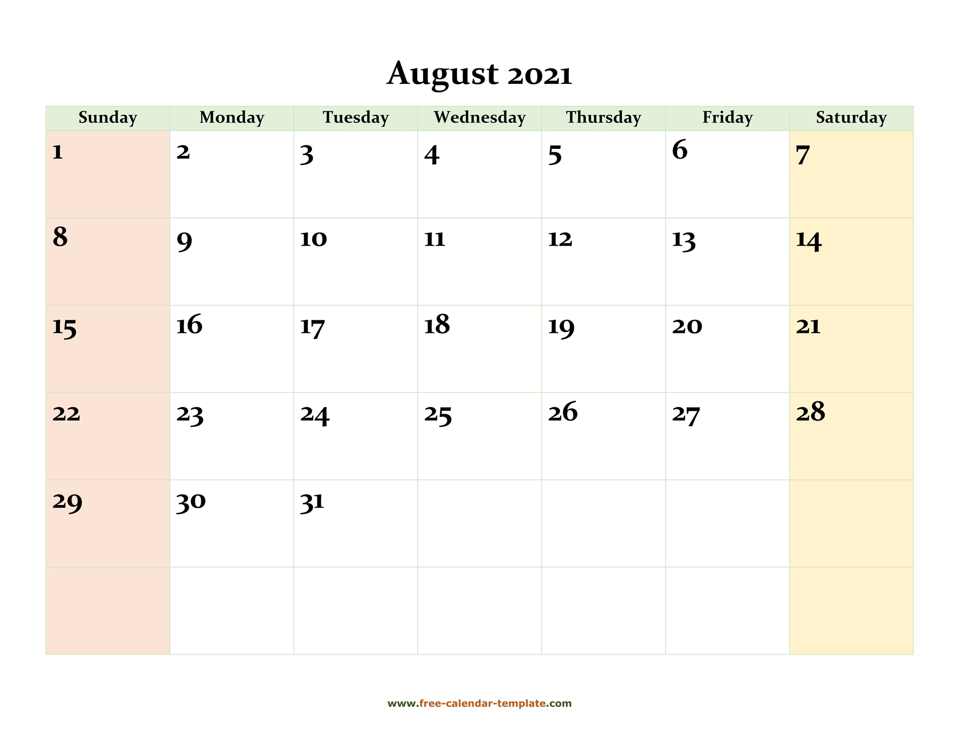 August 2021 Calendar Printable with coloring on weekend, large box on each day for notes. Free August 2021 Calendar Printable, week starts on Sunday, US letter format (horizontal layout), one month per page, 12 pages. Available in DOCX (MS Word), PDF (Adobe Reader PDF) and JPG. Free download and print, non-commercial use only.