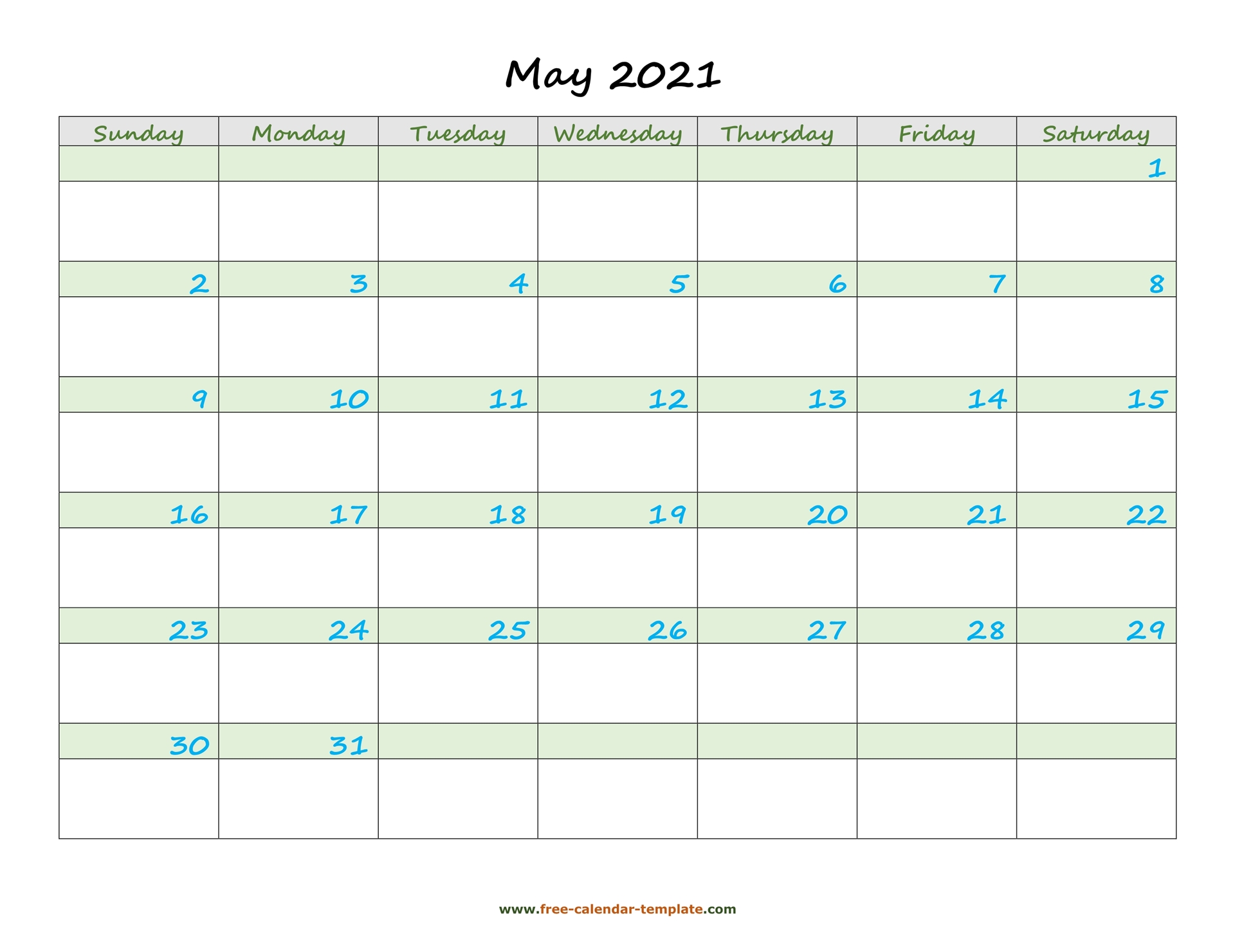May Calendar 2021 grid lines for holidays and notes (horizontal)