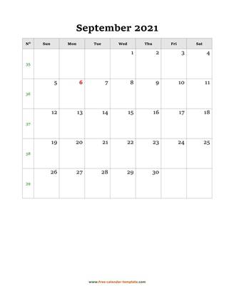 September Calendar 2021 grid lines for holidays and notes (horizontal)