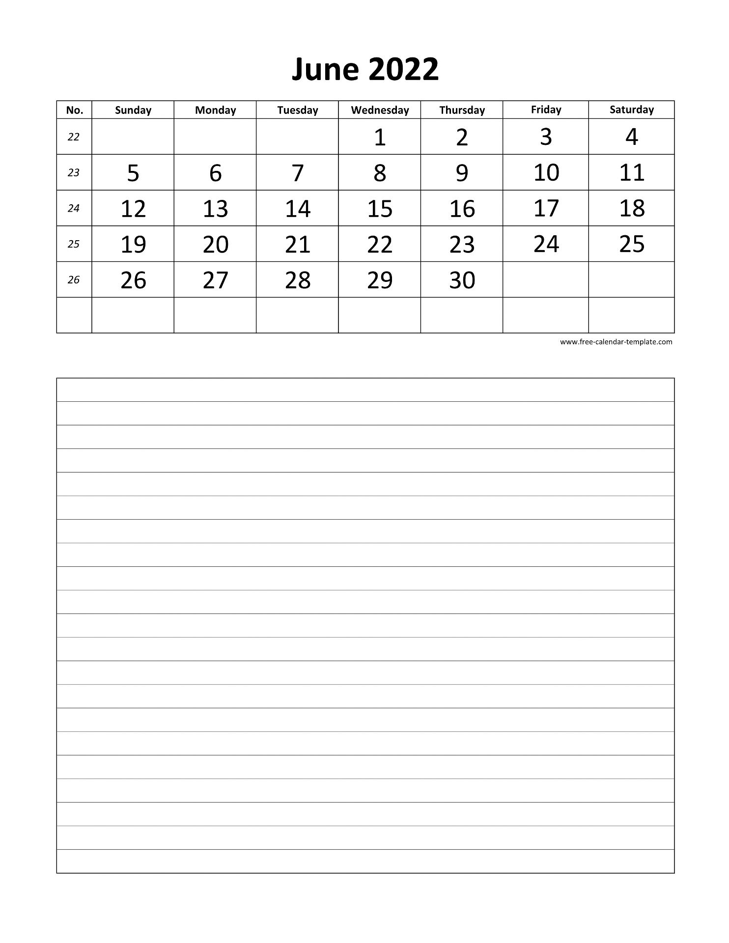 Printable 2022 June Calendar with grid lines for notes on the bottom for each day. Free Printable 2022 June Calendar, weeks starting on Sunday, US letter paper format (vertical layout), 12 months calendar on each page. Free download as DOCX (MS Word), PDF (Adobe Reader PDF) and JPG.