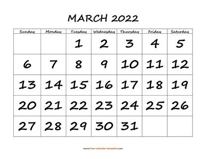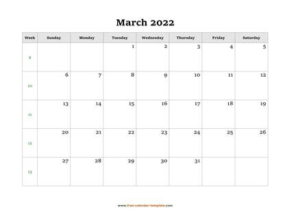 March Calendar 2022 simple design with large box on each day for notes.
