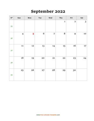 September Calendar 2022 grid lines for holidays and notes (horizontal)