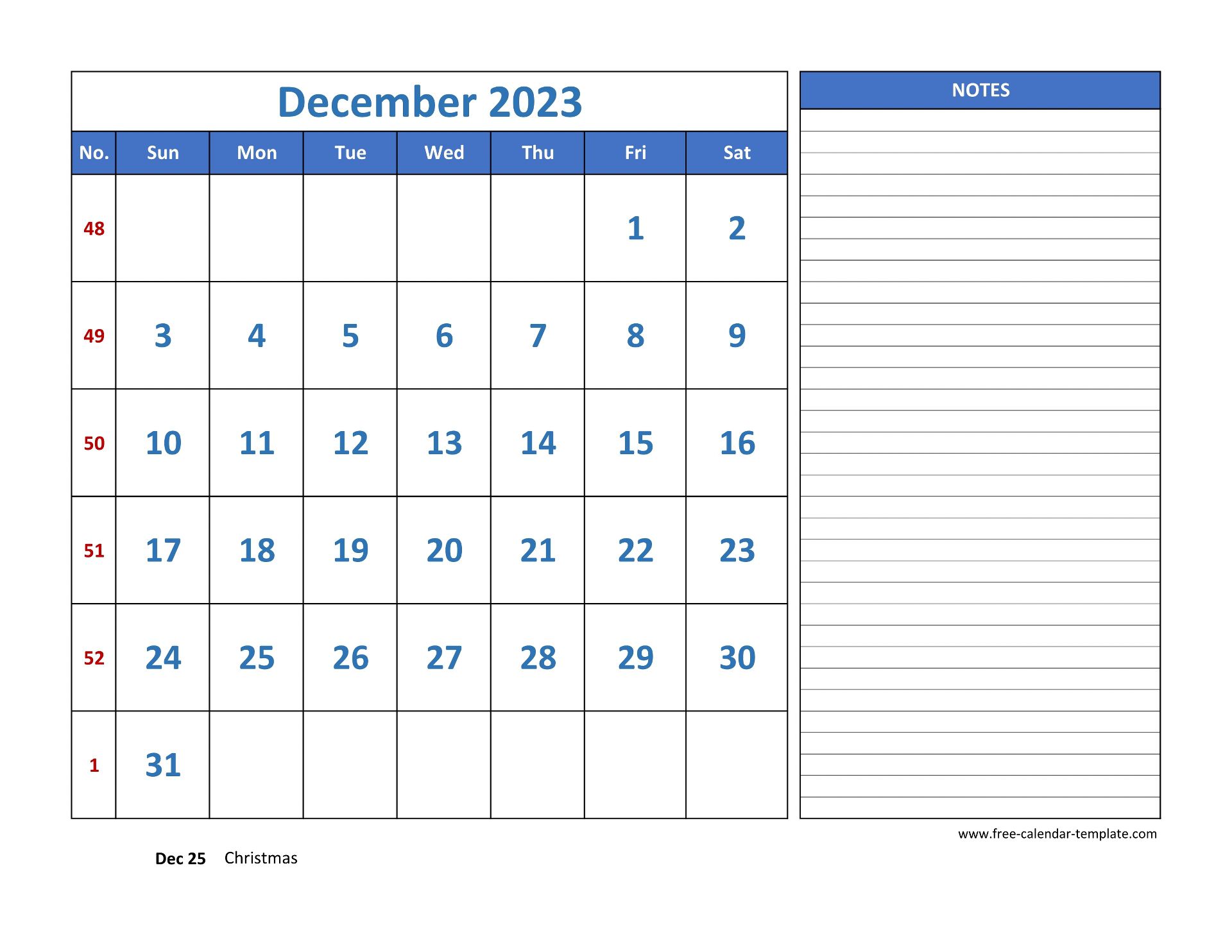 December Calendar 2023 with grid lines for holidays and notes, including week numbers, holidays on red and listed on the right. Free December Calendar 2023, weeks starting with Sunday, US letter format (horizontal layout), one month calendar printed on each page. The available file formats are DOCX (MS Word), PDF (Adobe Reader PDF) and JPG. Free download and print at home or at work.