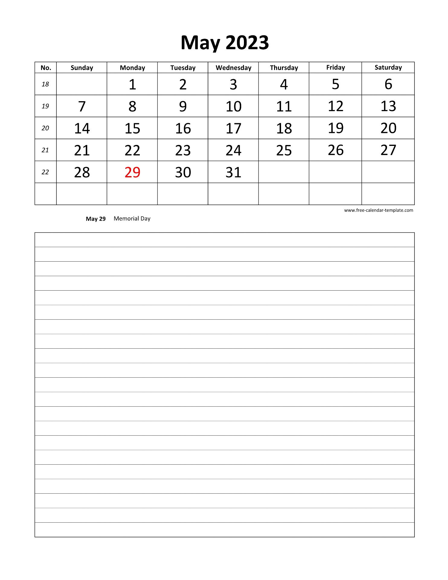 Printable 2023 May Calendar with grid lines for notes on the bottom for each day. Free Printable 2023 May Calendar, weeks starting on Sunday, US letter paper format (vertical layout), 12 months calendar on each page. Free download as DOCX (MS Word), PDF (Adobe Reader PDF) and JPG.