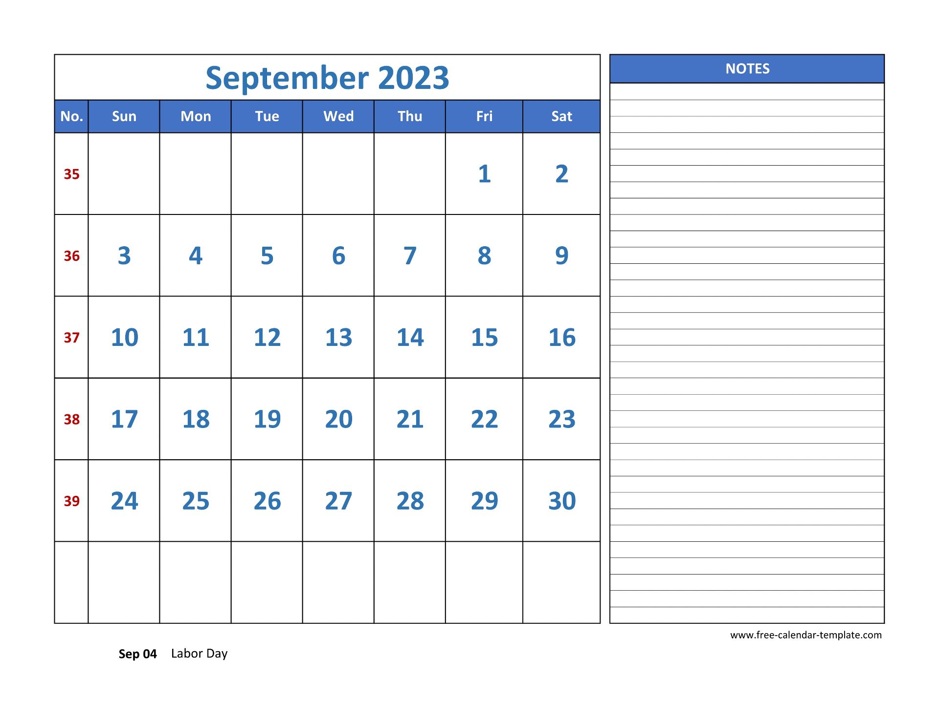September Calendar 2023 with grid lines for holidays and notes, including week numbers, holidays on red and listed on the right. Free September Calendar 2023, weeks starting with Sunday, US letter format (horizontal layout), one month calendar printed on each page. The available file formats are DOCX (MS Word), PDF (Adobe Reader PDF) and JPG. Free download and print at home or at work.