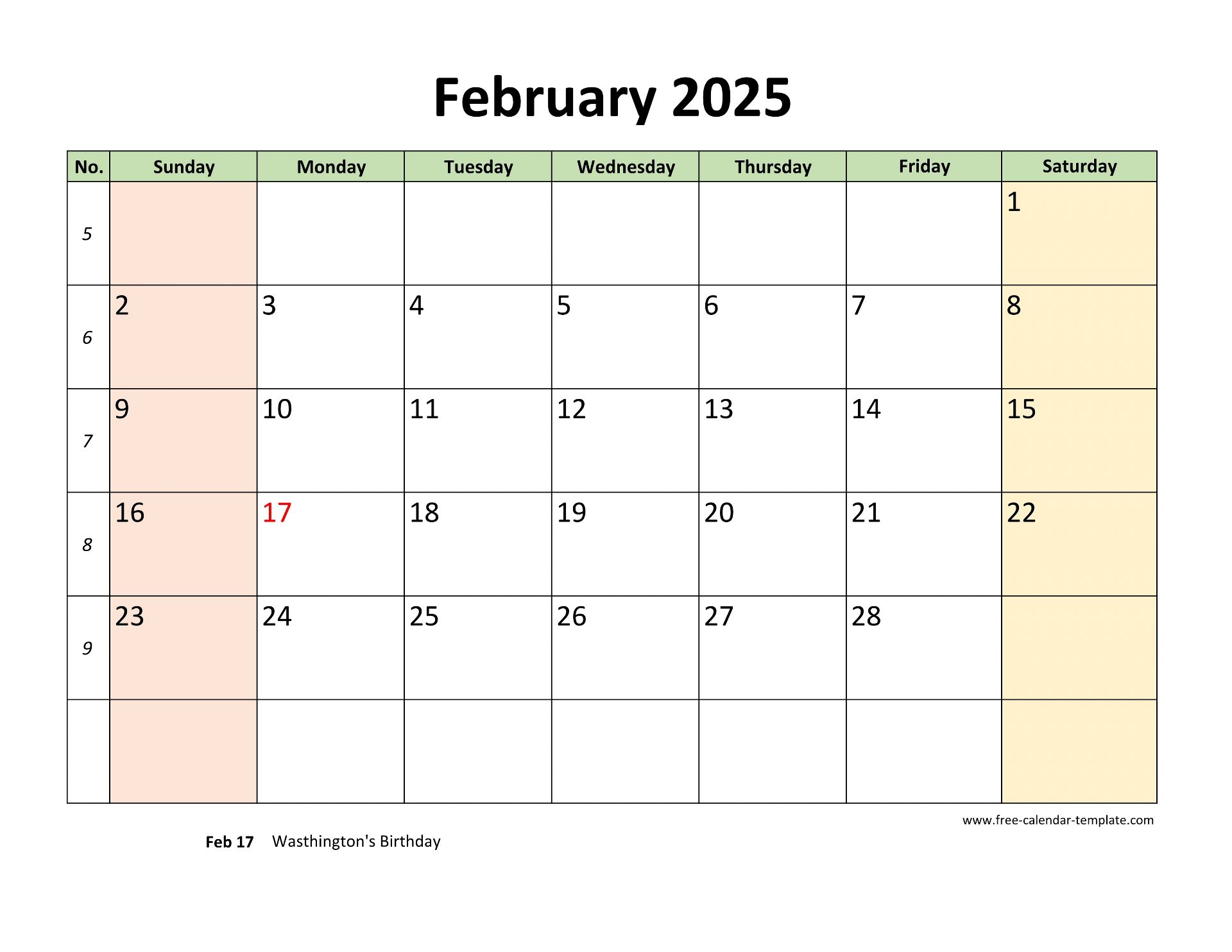 February 2025 Calendar Printable with coloring on weekend, large box on each day for notes. Free February 2025 Calendar Printable, week starts on Sunday, US letter format (horizontal layout), one month per page, 12 pages. Available in DOCX (MS Word), PDF (Adobe Reader PDF) and JPG. Free download and print, non-commercial use only.