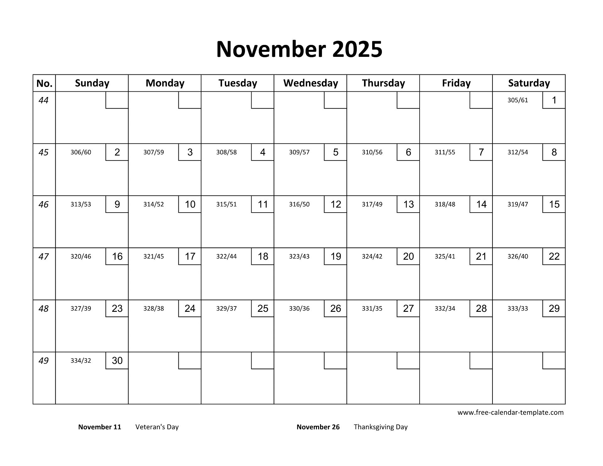 November Calendar 2025 Printable with checkboxes for each day. Free November Calendar 2025 Printable, week starts on Sunday, US letter format (horizontal layout), one month per page. The available file formats are DOCX (MS Word), PDF (Adobe Reader PDF) and JPG. Free download and print.