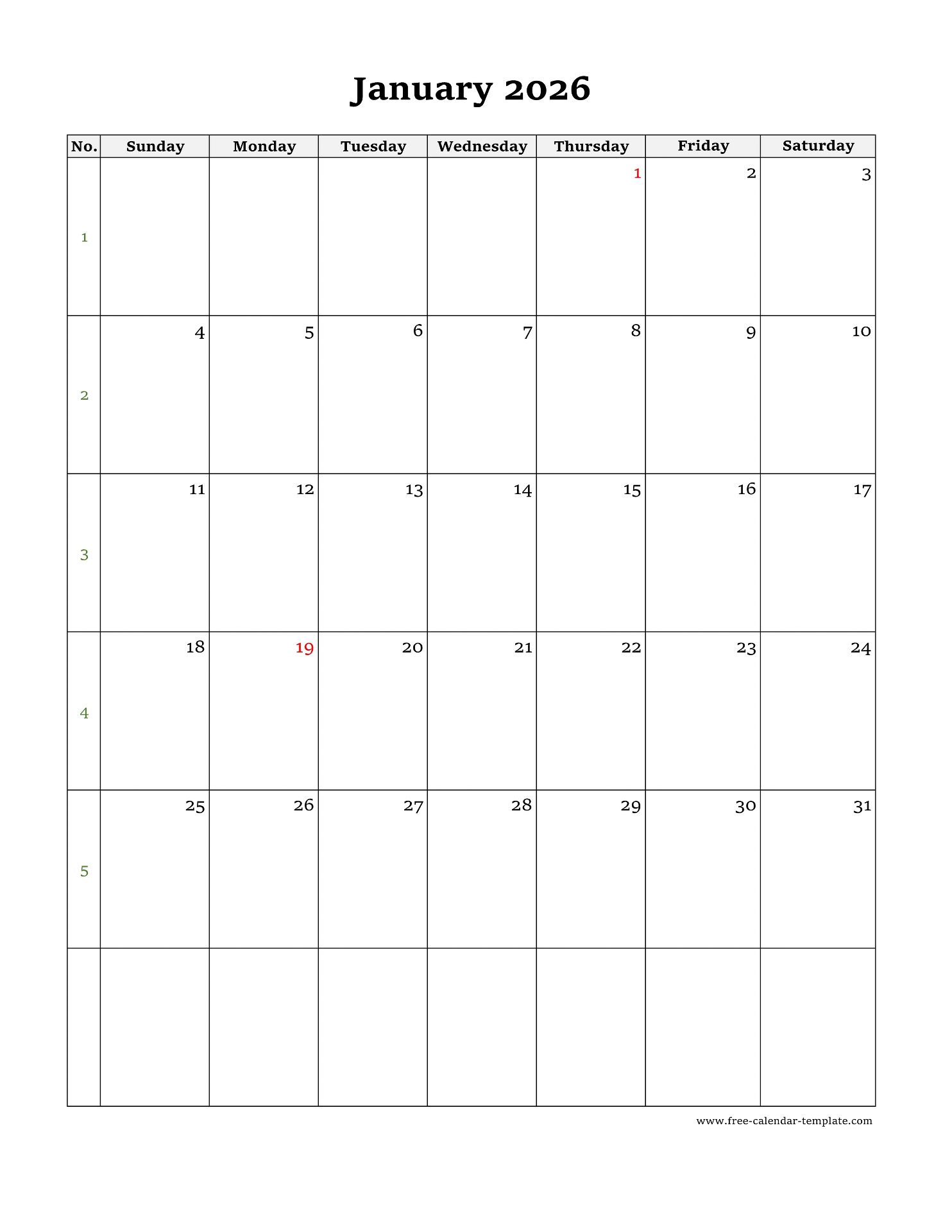 January Calendar 2026 simple design with large box on each day for notes, holidays on red. January Calendar 2026 simple blank template, week starts on Sunday, US letter format (vertical/portrait layout), 12 pages for 12 months calendar. Download as DOCX (MS Word), PDF (Adobe Reader PDF) and JPG, edit, add own events, notes, appointments and print.