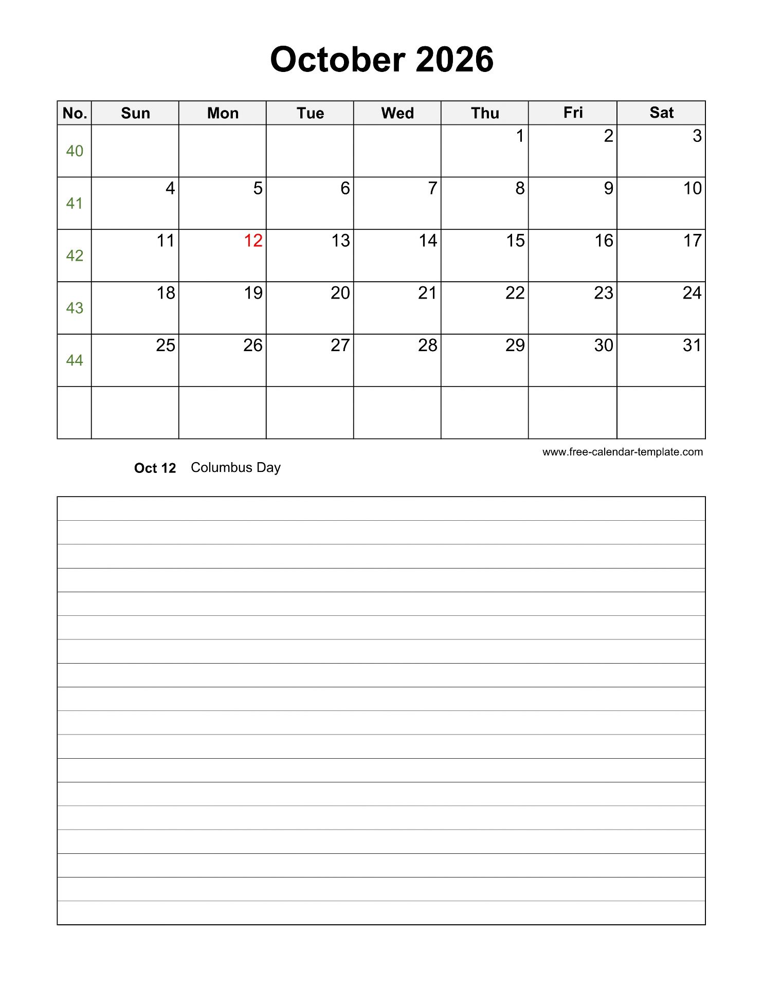 Printable October 2026 Calendar with with space for notes and events, appointments, including week numbers, US federal holidays. Free October 2026 Calendar, week starts on Sunday, US letter format (vertical/portrait layout), one month calendar on each page (12 pages). Available in DOCX (MS Word), PDF and JPG. Free download and print.