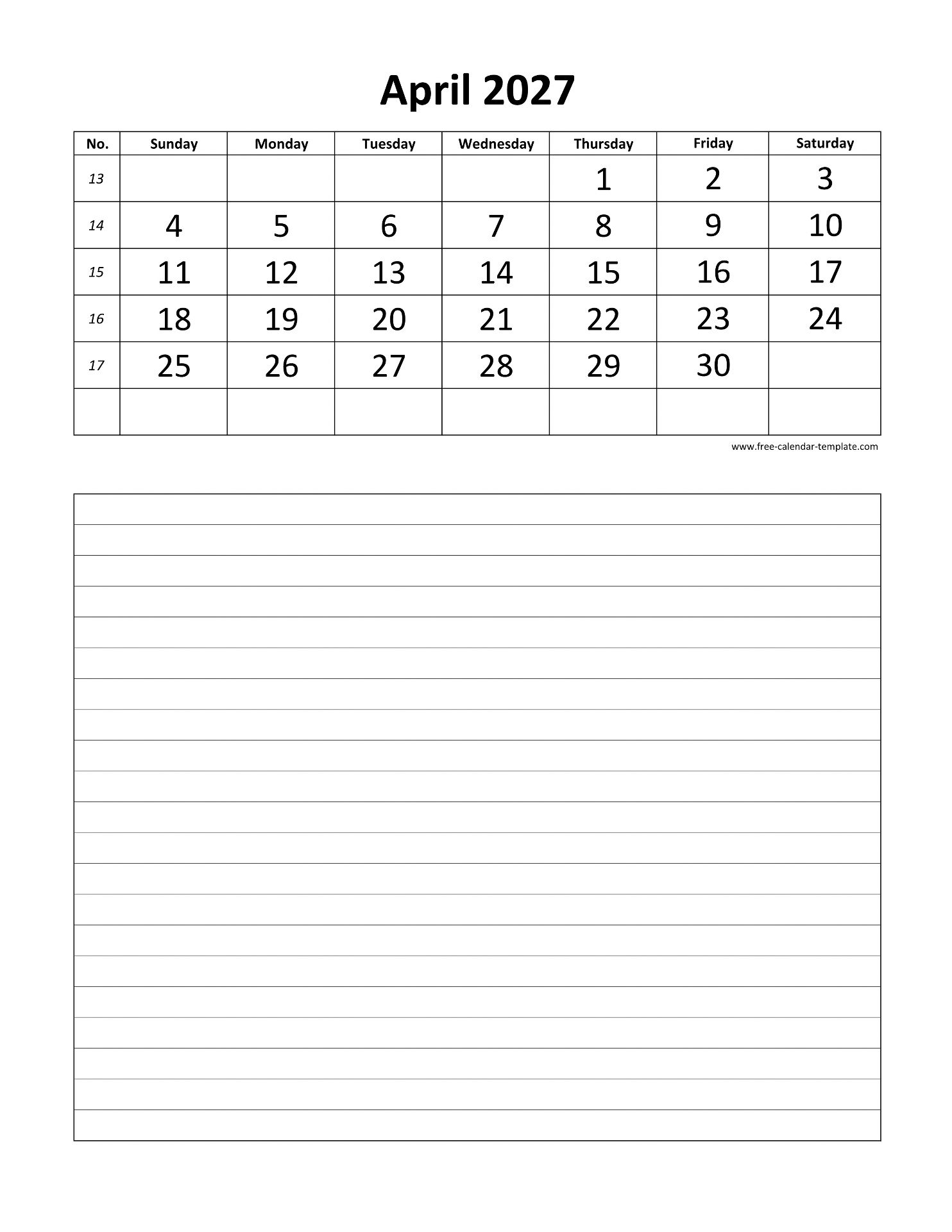 Printable 2027 April Calendar with grid lines for notes on the bottom for each day. Free Printable 2027 April Calendar, weeks starting on Sunday, US letter paper format (vertical layout), 12 months calendar on each page. Free download as DOCX (MS Word), PDF (Adobe Reader PDF) and JPG.