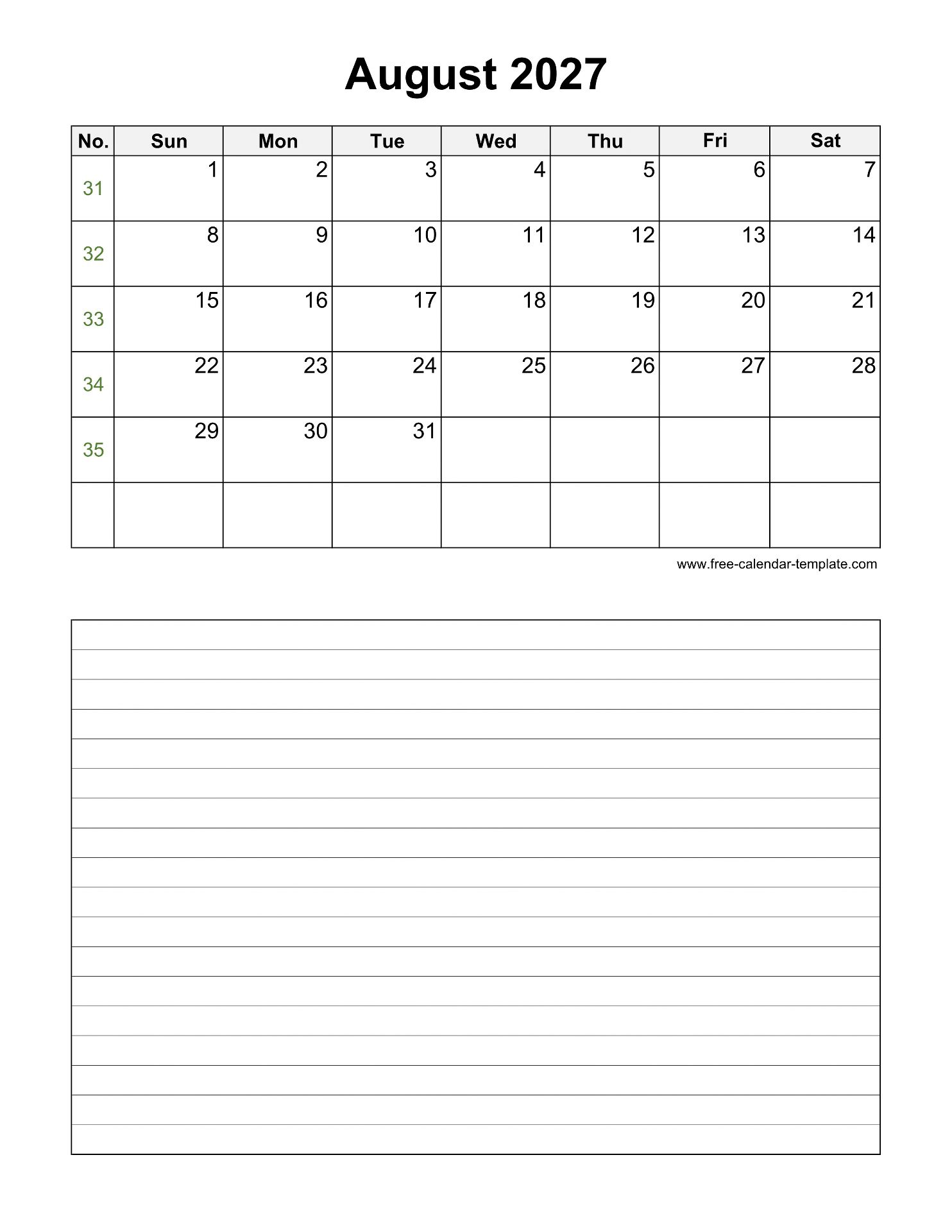 Free 2027 Calendar (Blank August Template)