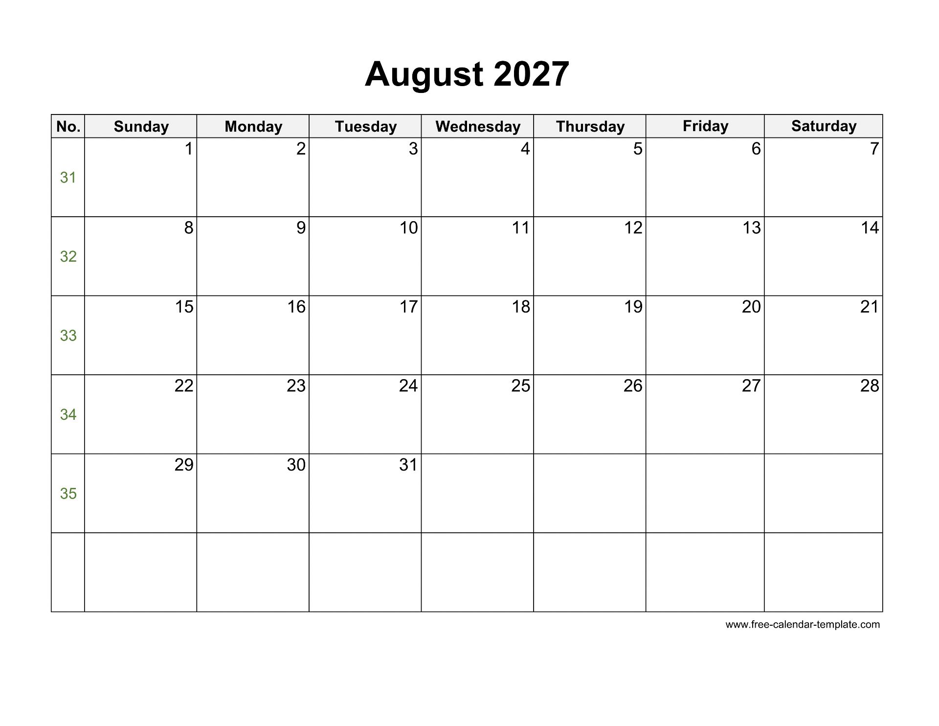 Free 2027 Calendar Blank August Template including us holidays, week numbers, large box for notes. Free 2027 Calendar, week starts on Sunday, US letter format (horizontal/landscape layout), 12 pages - one month per page. Download as DOCX (MS Word), PDF (Adobe Reader PDF) and JPG and print, non-commercial use only.