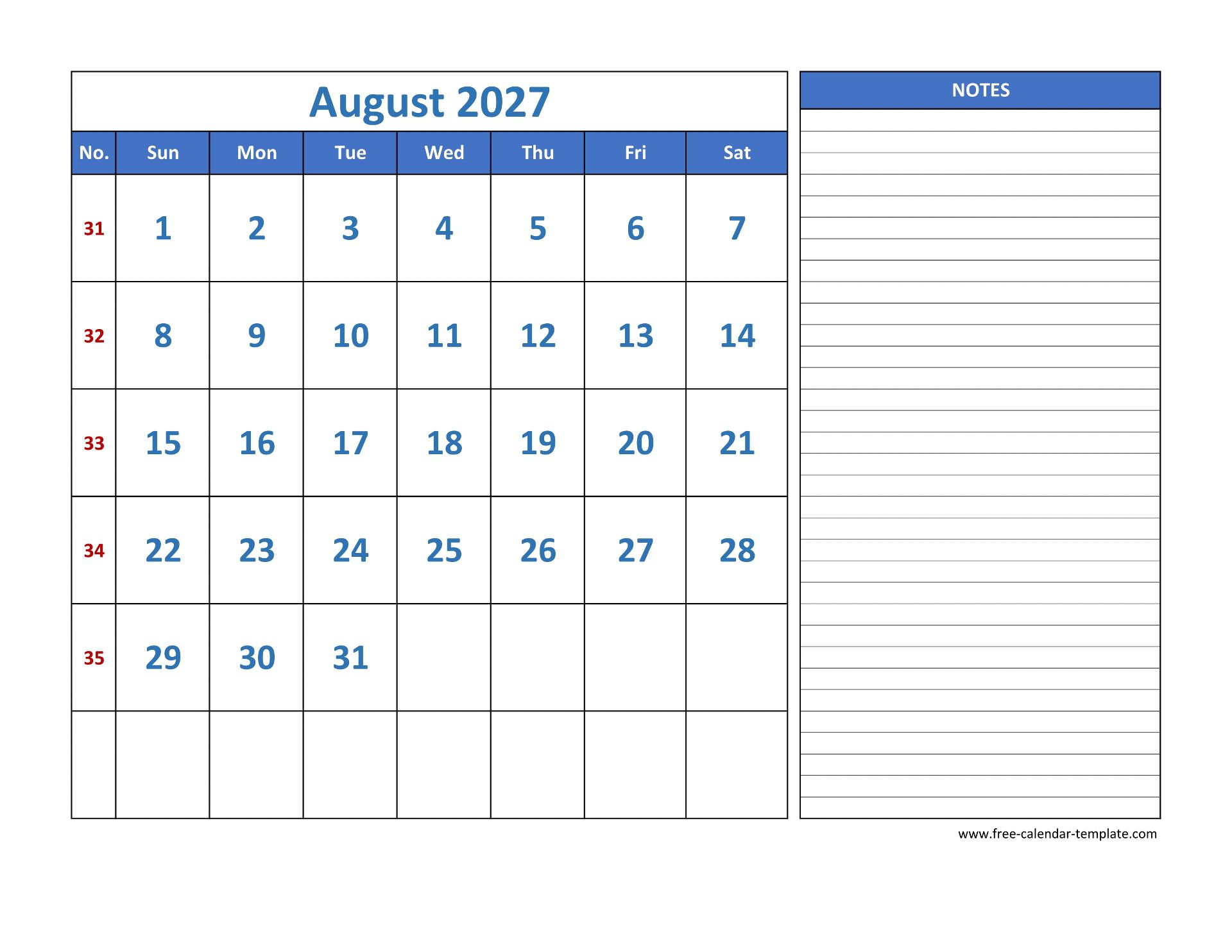 August Calendar 2027 with grid lines for holidays and notes, including week numbers, holidays on red and listed on the right. Free August Calendar 2027, weeks starting with Sunday, US letter format (horizontal layout), one month calendar printed on each page. The available file formats are DOCX (MS Word), PDF (Adobe Reader PDF) and JPG. Free download and print at home or at work.