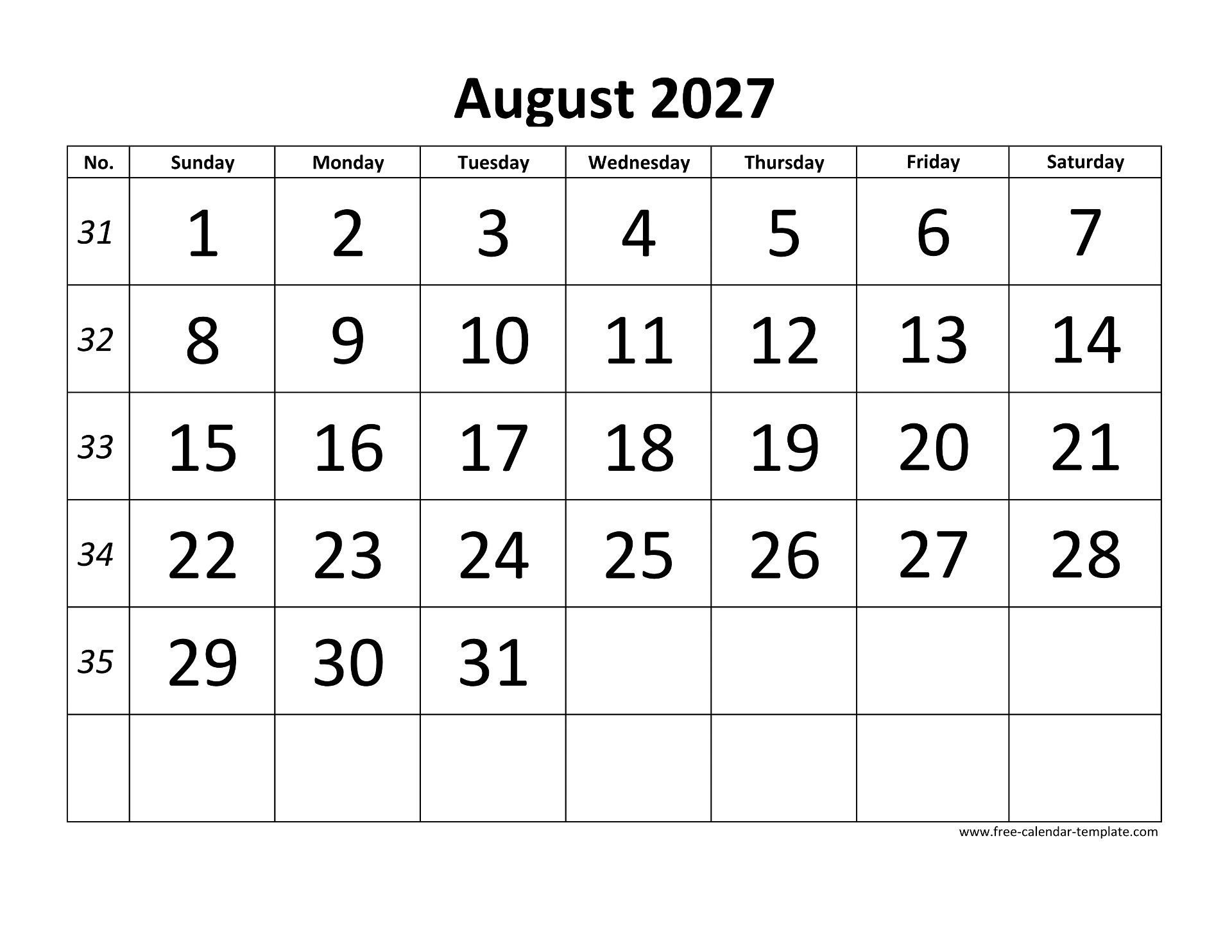 August 2027 Calendar designed with large font, US holidays on red. Free August 2027 Calendar, week starts on Sunday, US letter format (horizontal layout), one month calendar printed on each page. The available file formats are DOCX (MS Word), PDF (Adobe Reader PDF) and JPG. Free download and print at home or at work.