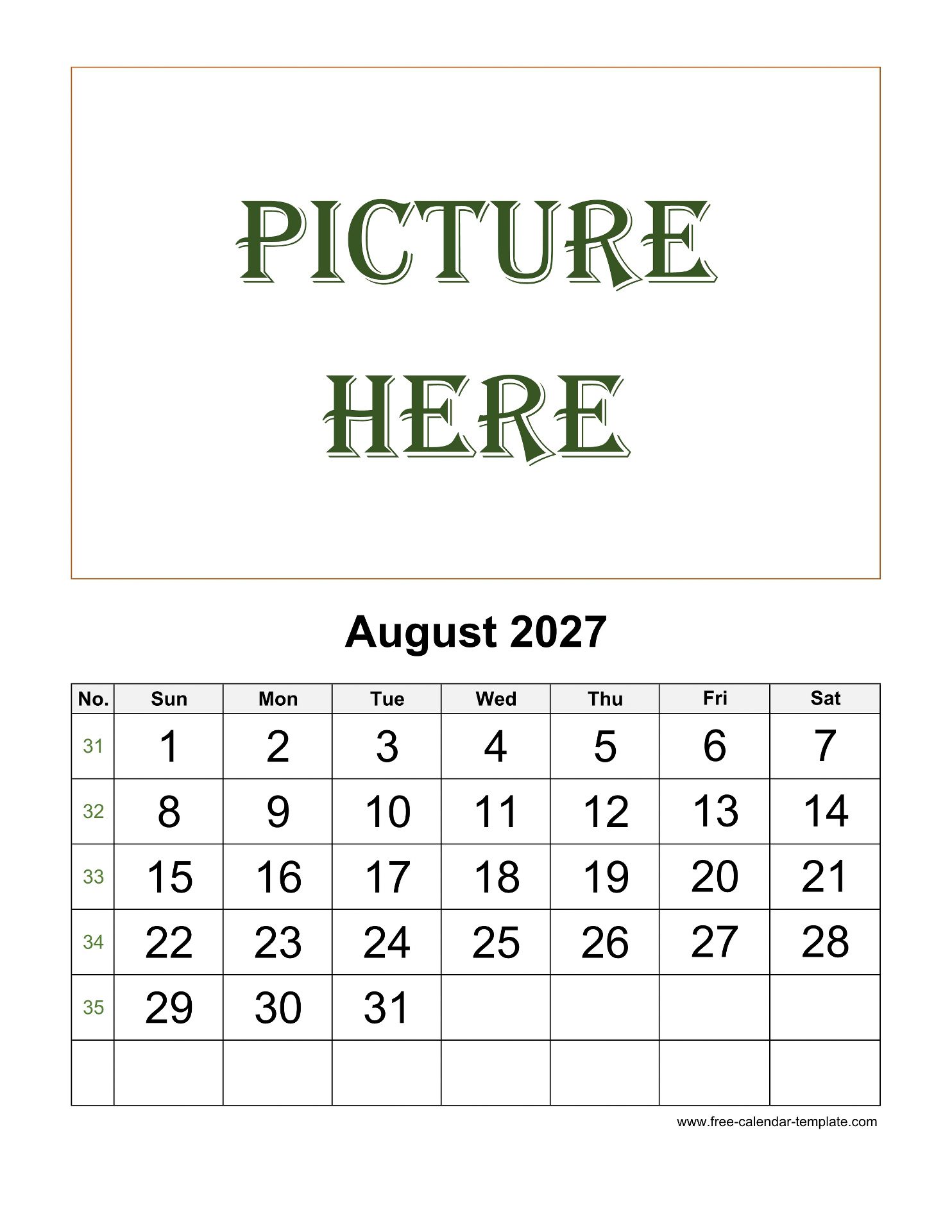 August Printable 2027 Picture Calendar, pictures can be placed at the top of each month. Free 2027 Picture Calendar, weeks starting on Sunday, US letter paper format (vertical/portrait layout), 12 months calendar on each page. Free download as DOCX (MS Word), PDF (Adobe Reader PDF) and JPG.