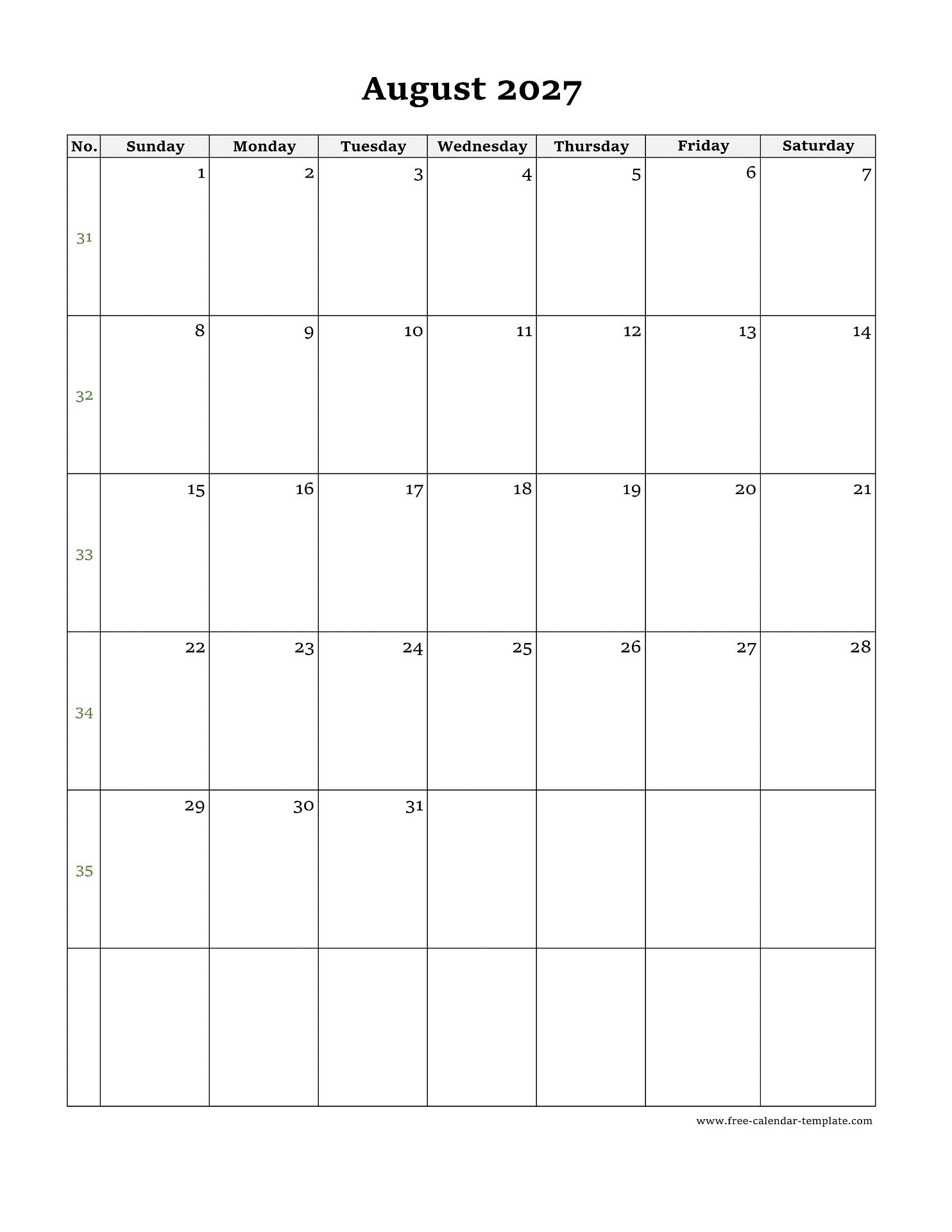 August Calendar 2027 simple design with large box on each day for notes, holidays on red. August Calendar 2027 simple blank template, week starts on Sunday, US letter format (vertical/portrait layout), 12 pages for 12 months calendar. Download as DOCX (MS Word), PDF (Adobe Reader PDF) and JPG, edit, add own events, notes, appointments and print.