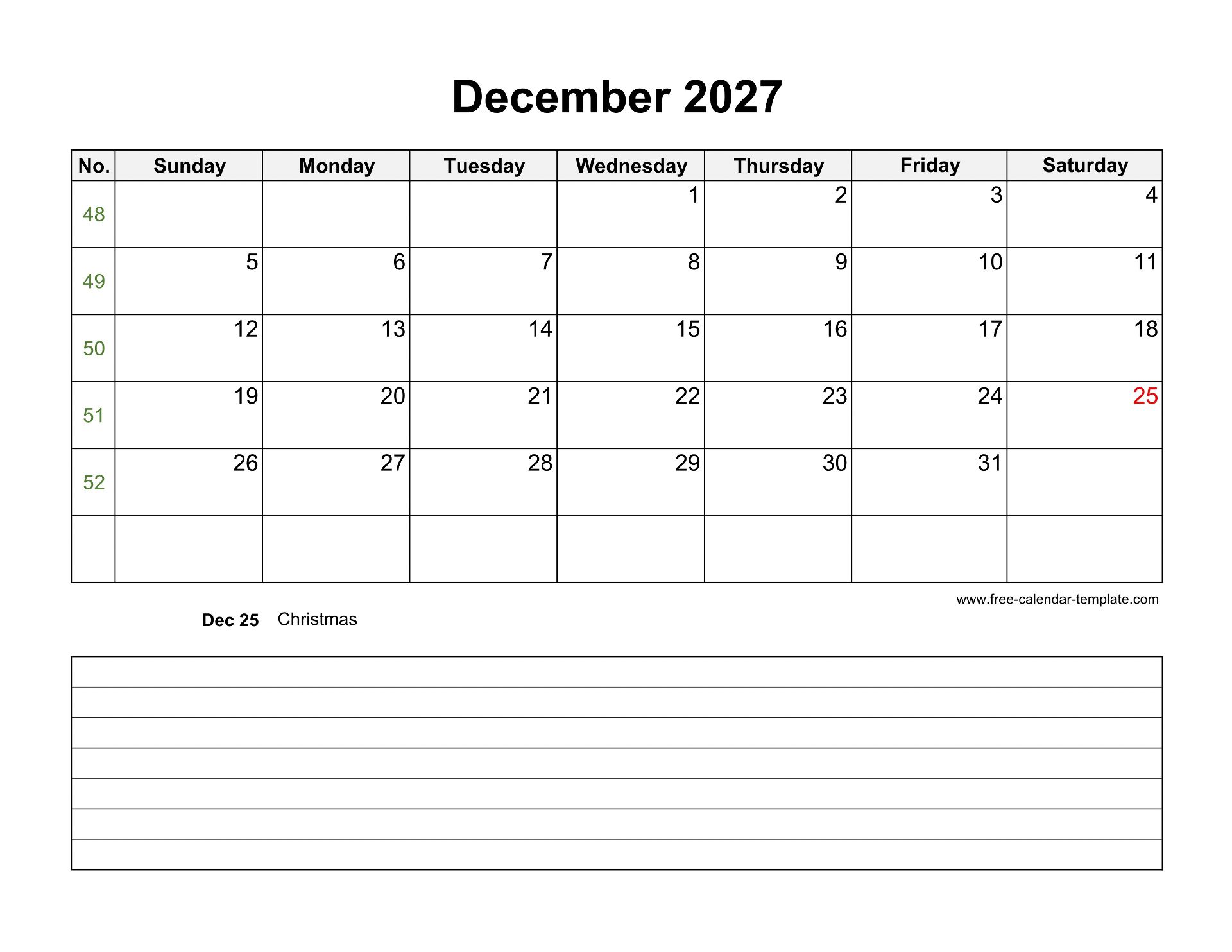 December Calendar 2027 grid lines for holidays and notes (horizontal)