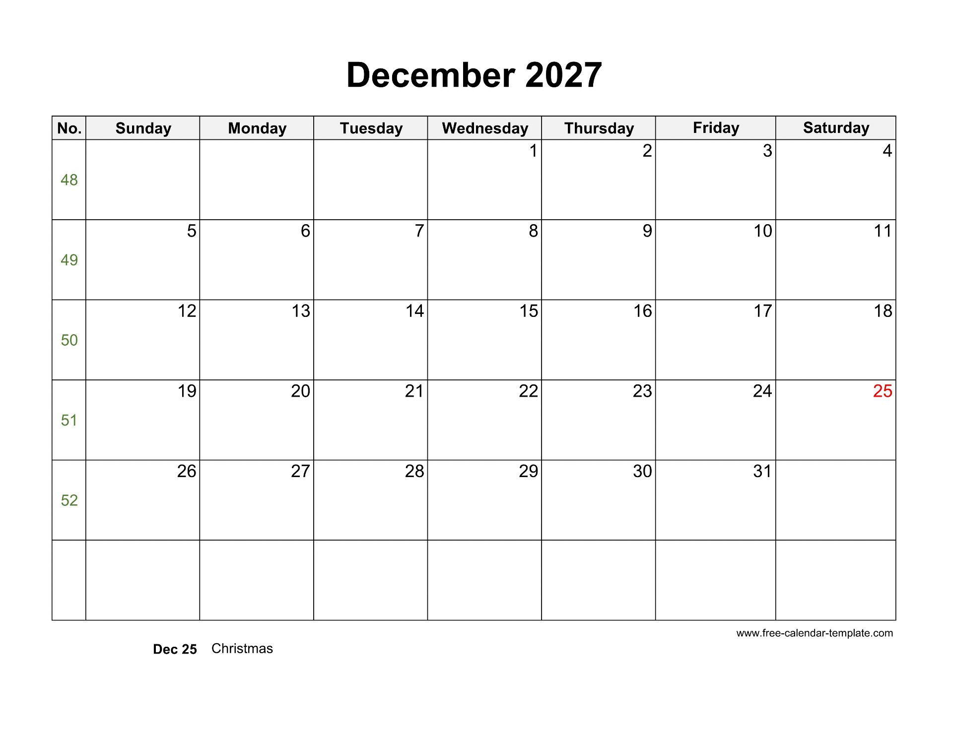 Free 2027 Calendar Blank December Template including us holidays, week numbers, large box for notes. Free 2027 Calendar, week starts on Sunday, US letter format (horizontal/landscape layout), 12 pages - one month per page. Download as DOCX (MS Word), PDF (Adobe Reader PDF) and JPG and print, non-commercial use only.