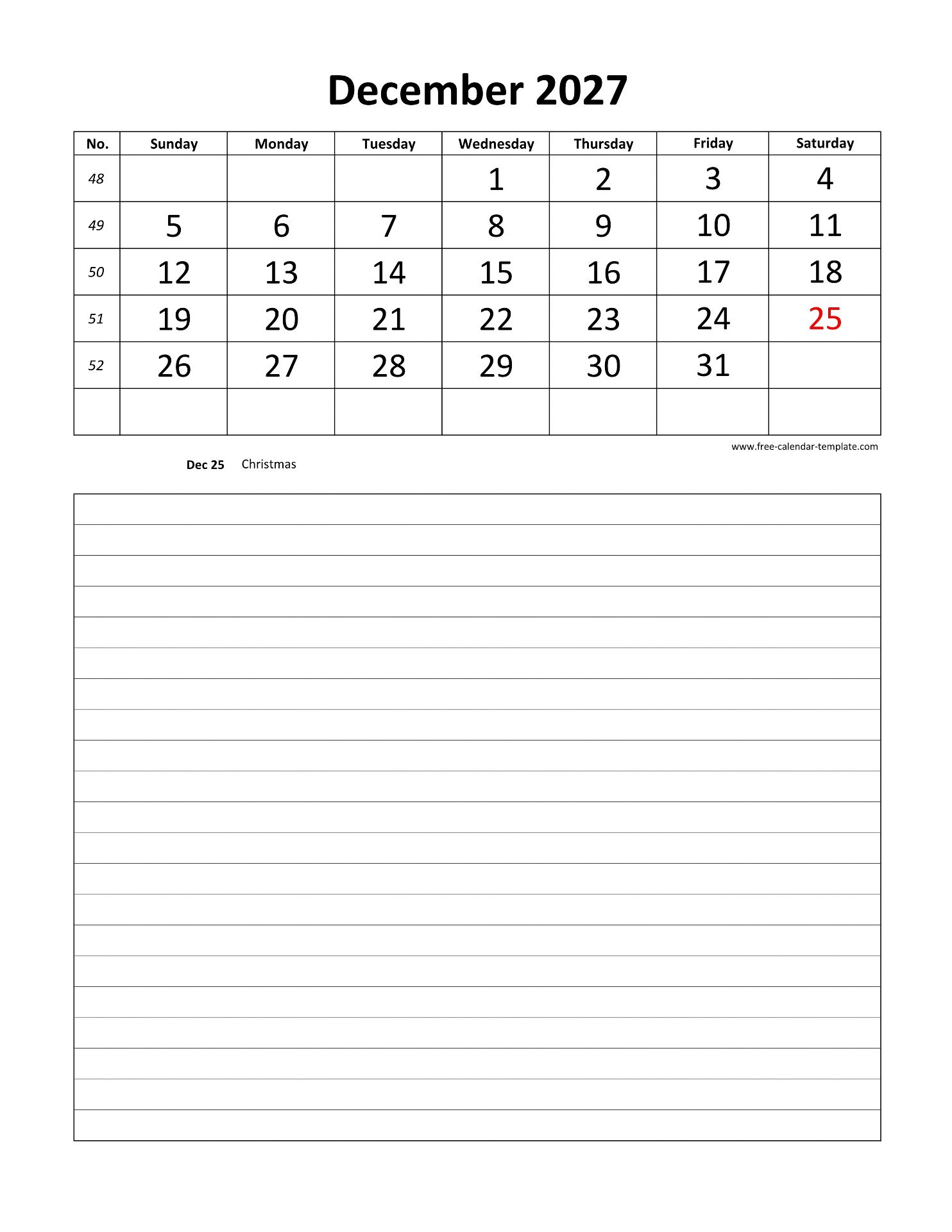 Printable 2027 December Calendar with grid lines for notes on the bottom for each day. Free Printable 2027 December Calendar, weeks starting on Sunday, US letter paper format (vertical layout), 12 months calendar on each page. Free download as DOCX (MS Word), PDF (Adobe Reader PDF) and JPG.