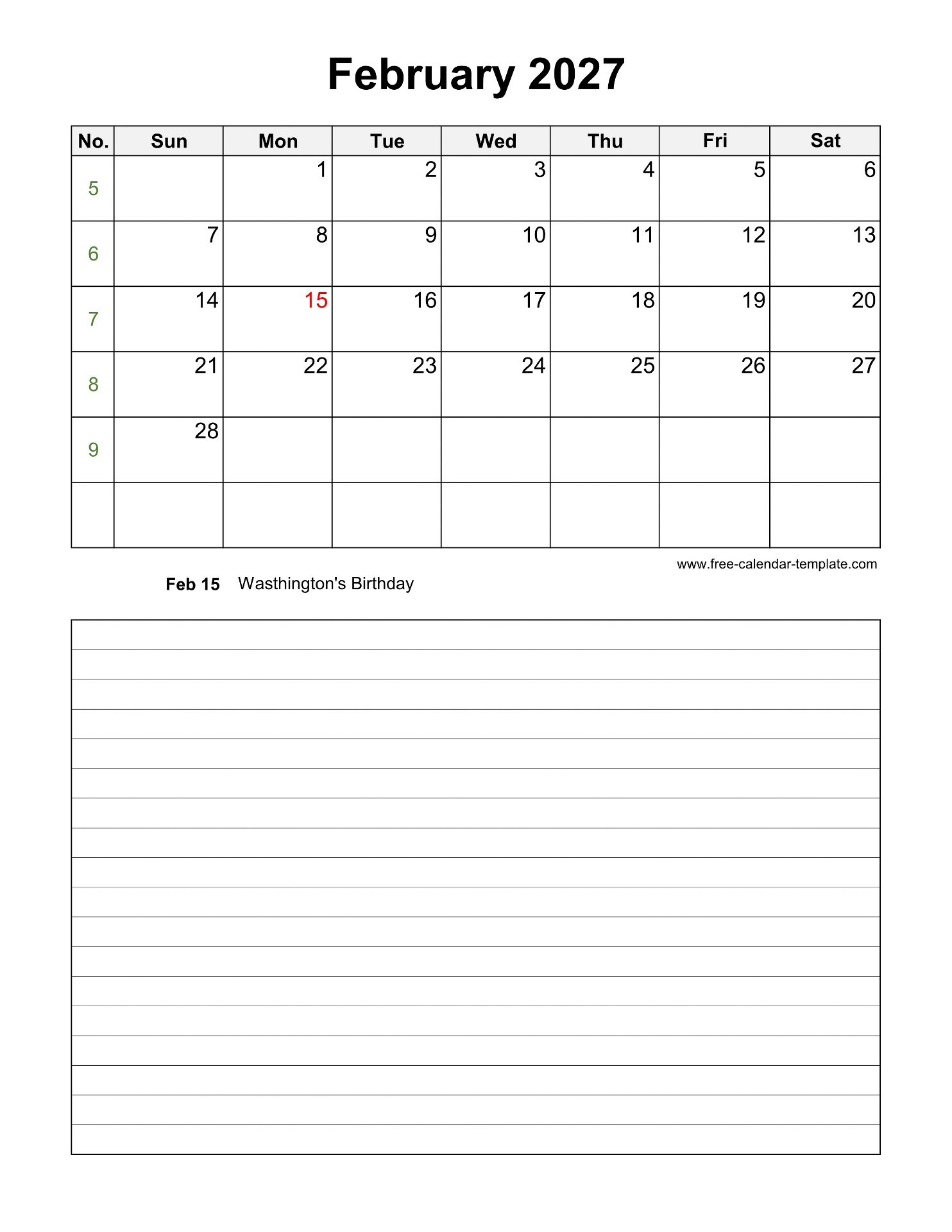 Printable February 2027 Calendar with with space for notes and events, appointments, including week numbers, US federal holidays. Free February 2027 Calendar, week starts on Sunday, US letter format (vertical/portrait layout), one month calendar on each page (12 pages). Available in DOCX (MS Word), PDF and JPG. Free download and print.