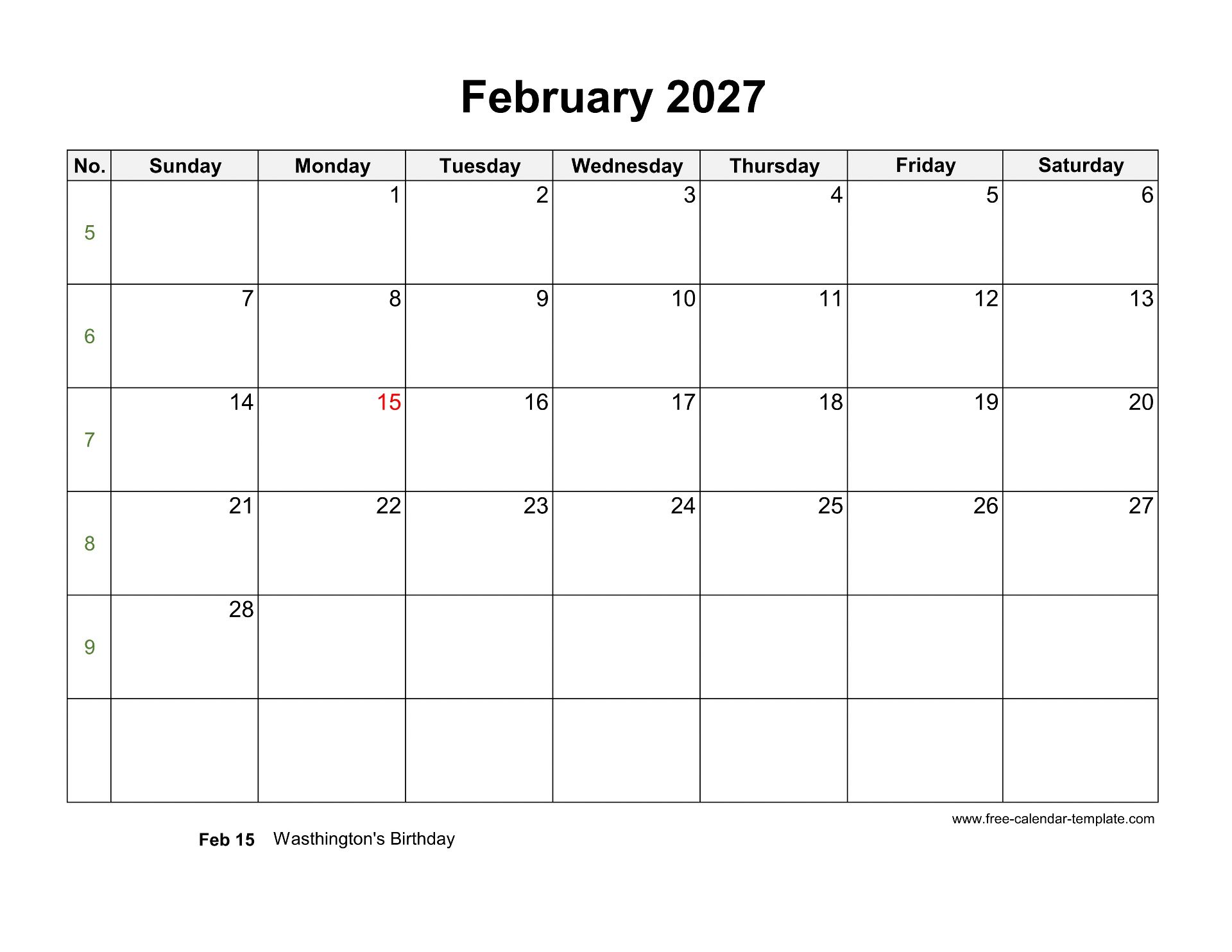Free 2027 Calendar Blank February Template including us holidays, week numbers, large box for notes. Free 2027 Calendar, week starts on Sunday, US letter format (horizontal/landscape layout), 12 pages - one month per page. Download as DOCX (MS Word), PDF (Adobe Reader PDF) and JPG and print, non-commercial use only.