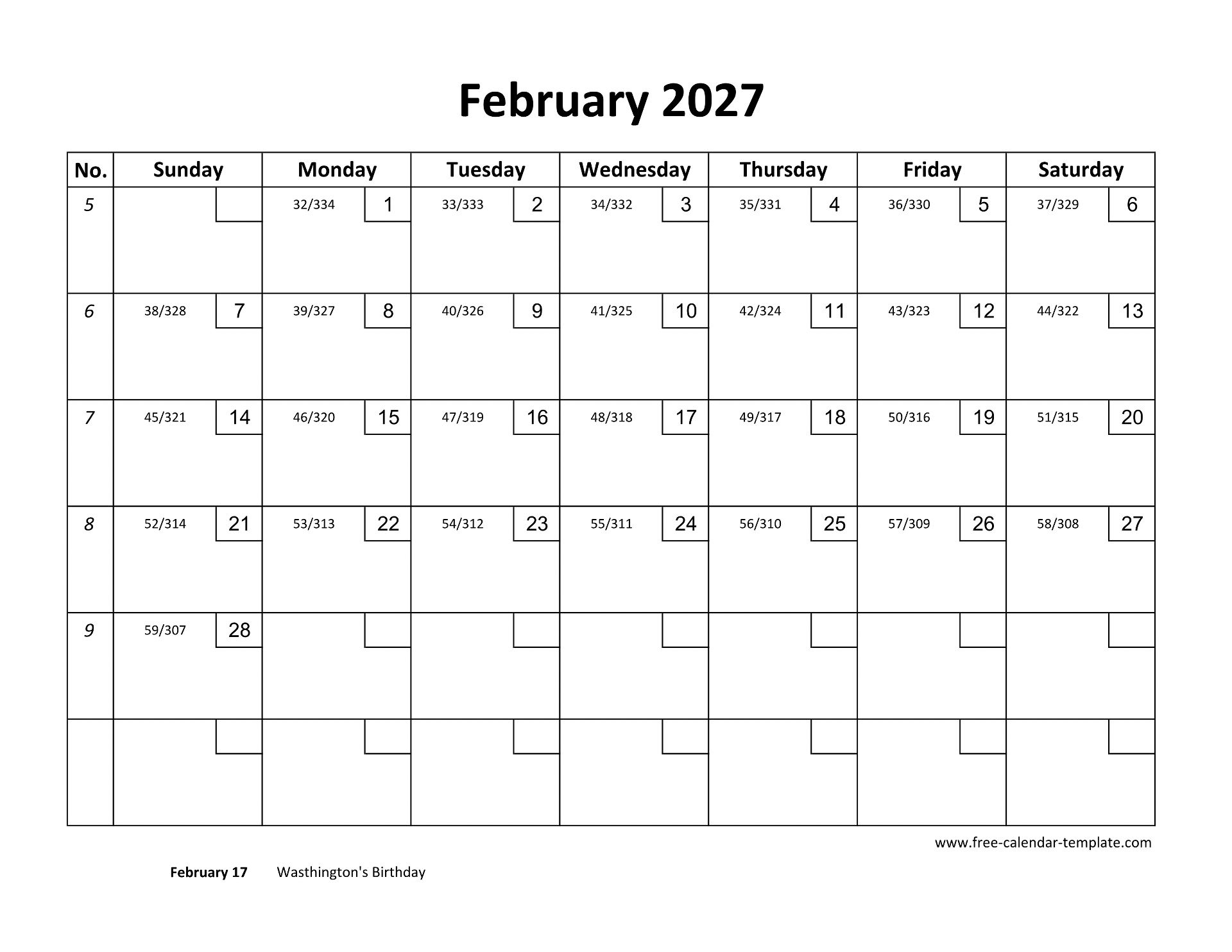 February Calendar 2027 grid lines for holidays and notes (horizontal)