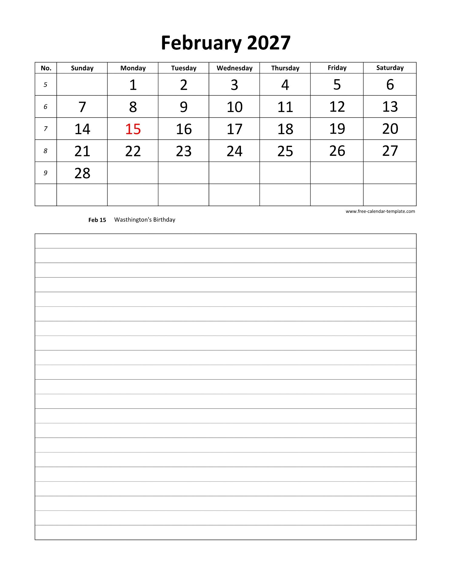 Printable 2027 February Calendar with grid lines for notes on the bottom for each day. Free Printable 2027 February Calendar, weeks starting on Sunday, US letter paper format (vertical layout), 12 months calendar on each page. Free download as DOCX (MS Word), PDF (Adobe Reader PDF) and JPG.