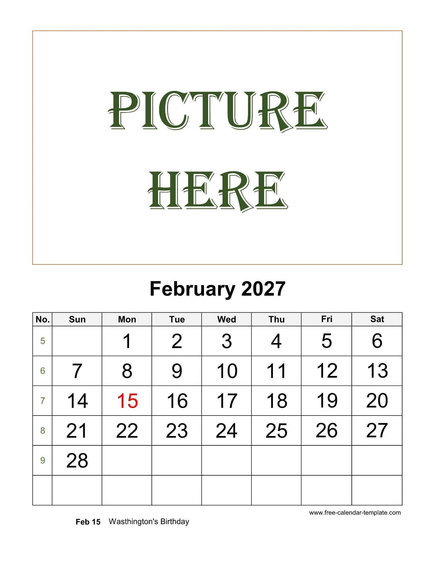 February Printable 2027 Picture Calendar, pictures can be placed at the top of each month. Free 2027 Picture Calendar, weeks starting on Sunday, US letter paper format (vertical/portrait layout), 12 months calendar on each page. Free download as DOCX (MS Word), PDF (Adobe Reader PDF) and JPG.