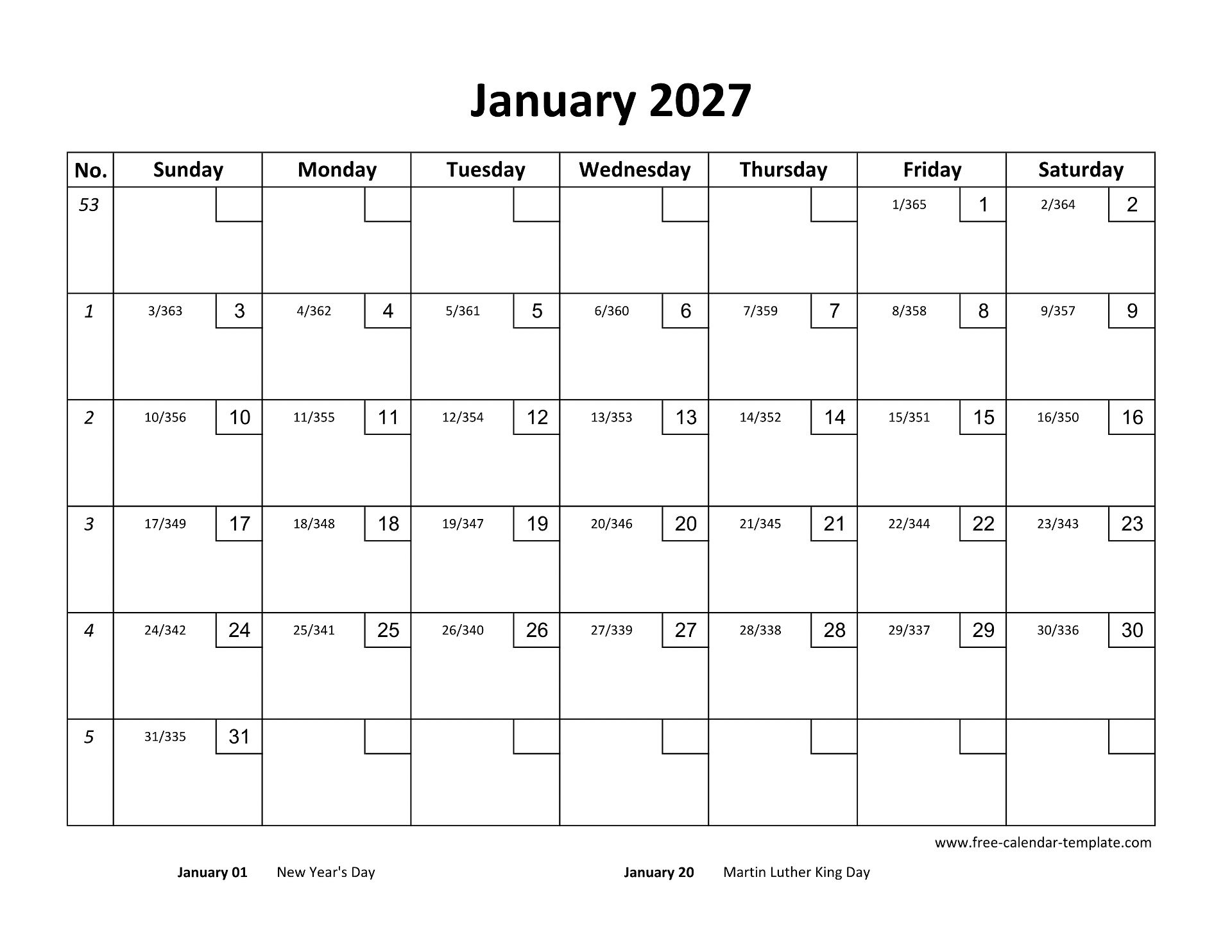 January Calendar 2027 Printable with checkboxes for each day. Free January Calendar 2027 Printable, week starts on Sunday, US letter format (horizontal layout), one month per page. The available file formats are DOCX (MS Word), PDF (Adobe Reader PDF) and JPG. Free download and print.
