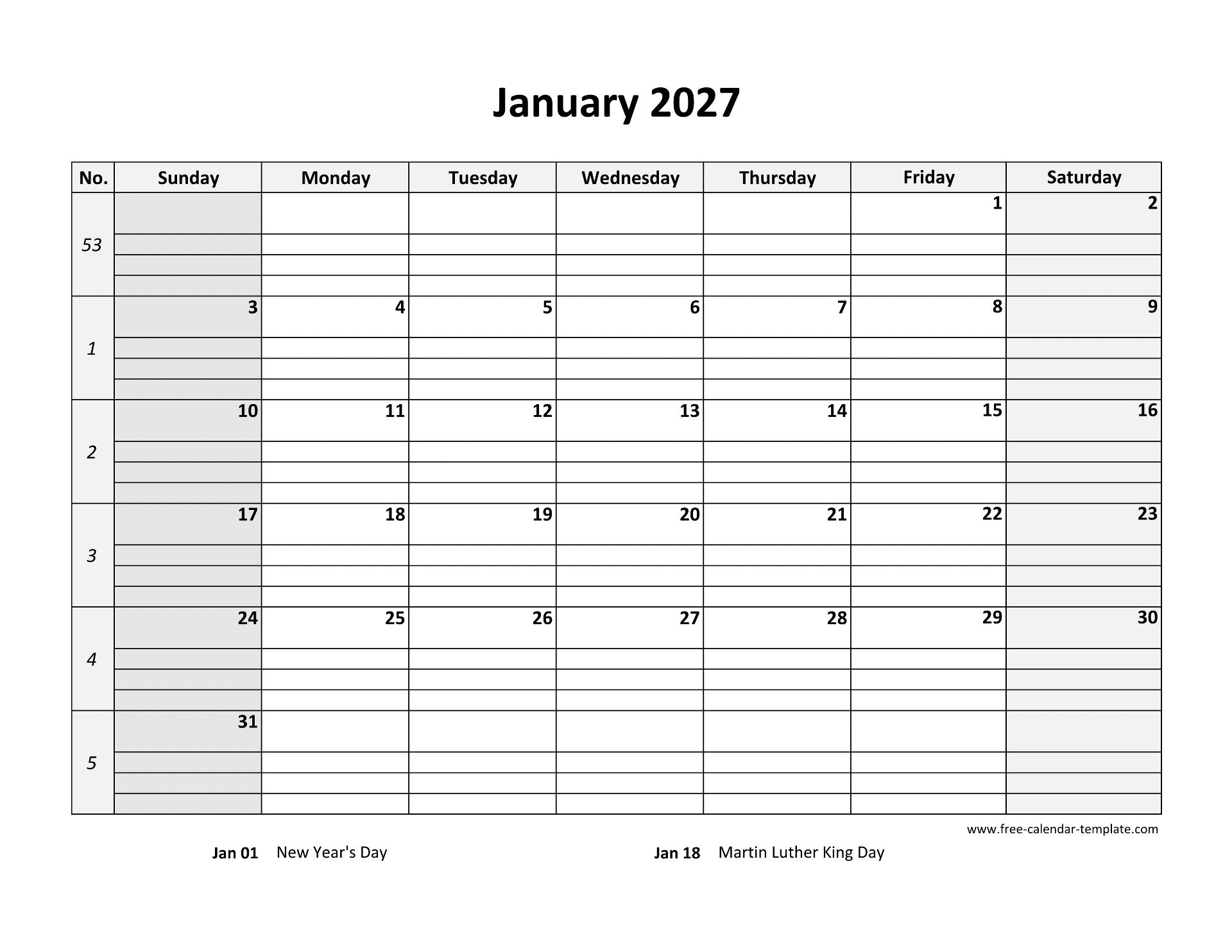 January Calendar 2027 grid lines for holidays and notes (horizontal)