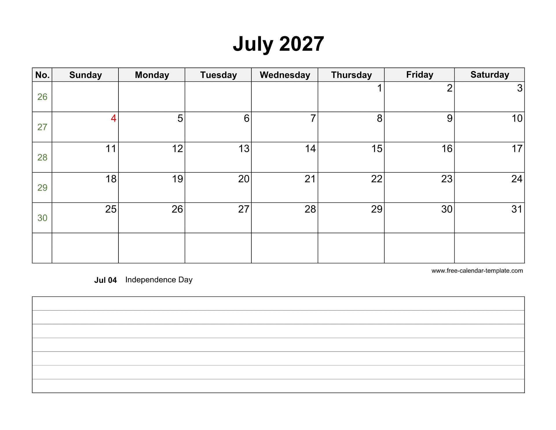 2027 Printable July Calendar with with space for appointments, notes and events, including week numbers, US federal holidays. Free 2027 Printable July Calendar, weeks starting with Sunday, US letter format (horizontal layout), one month calendar on each page (12 pages). Available in DOCX (MS Word), PDF and JPG. Free download and print.