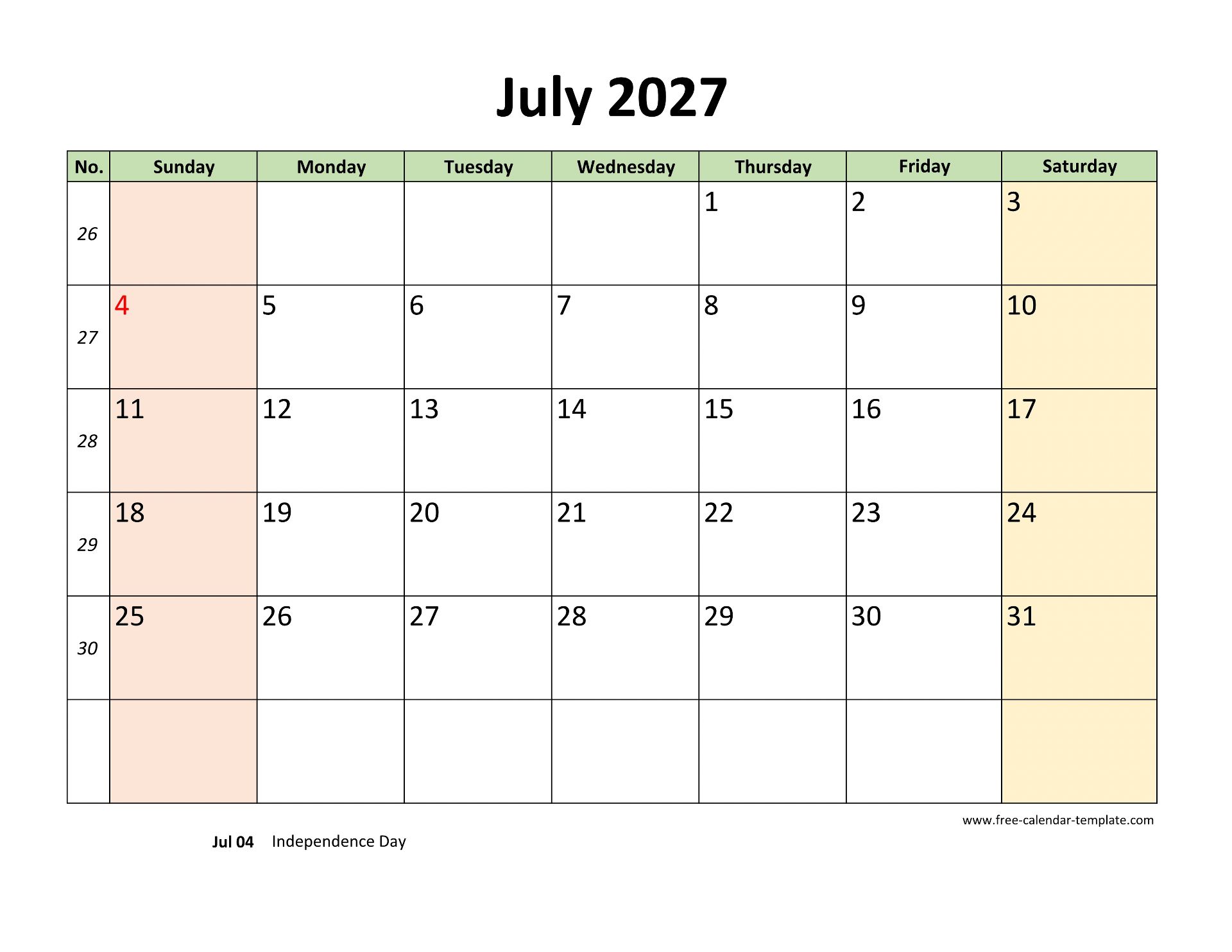 July 2027 Calendar Printable with coloring on weekend, large box on each day for notes. Free July 2027 Calendar Printable, week starts on Sunday, US letter format (horizontal layout), one month per page, 12 pages. Available in DOCX (MS Word), PDF (Adobe Reader PDF) and JPG. Free download and print, non-commercial use only.