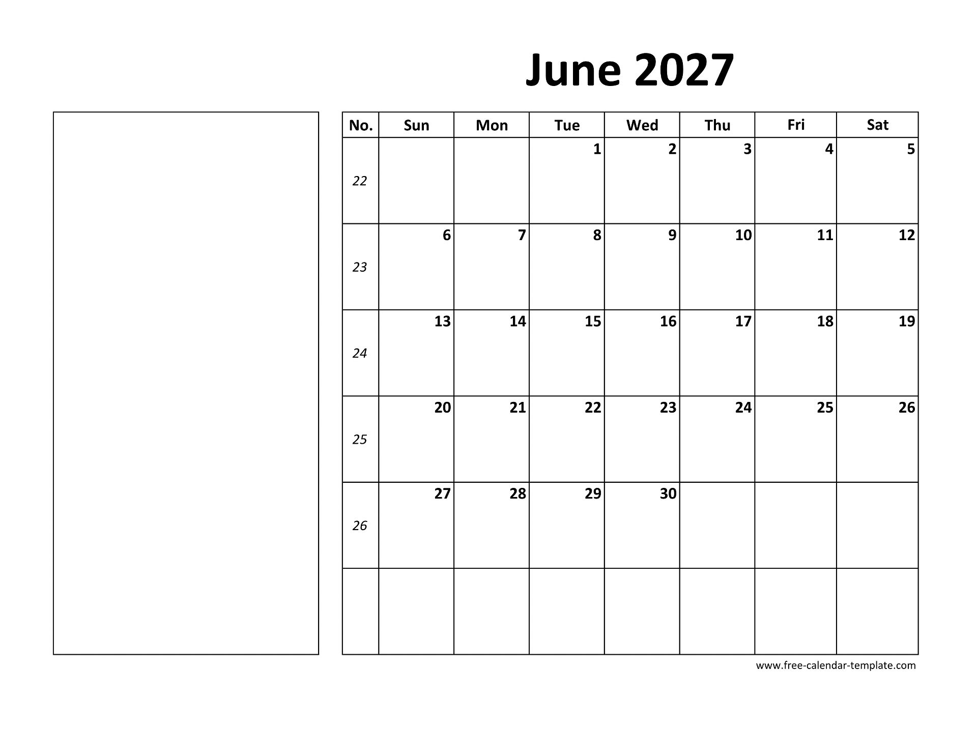Printable June 2027 Calendar with holidays, week numbers, large box for each day and grid line for notes. Free Printable June 2027 Calendar, week starts on Sunday, US letter format (horizontal layout), one month calendar printed on each page. The available file formats are DOCX (MS Word), PDF (Adobe Reader PDF) and JPG. Free download and print at home or at work.