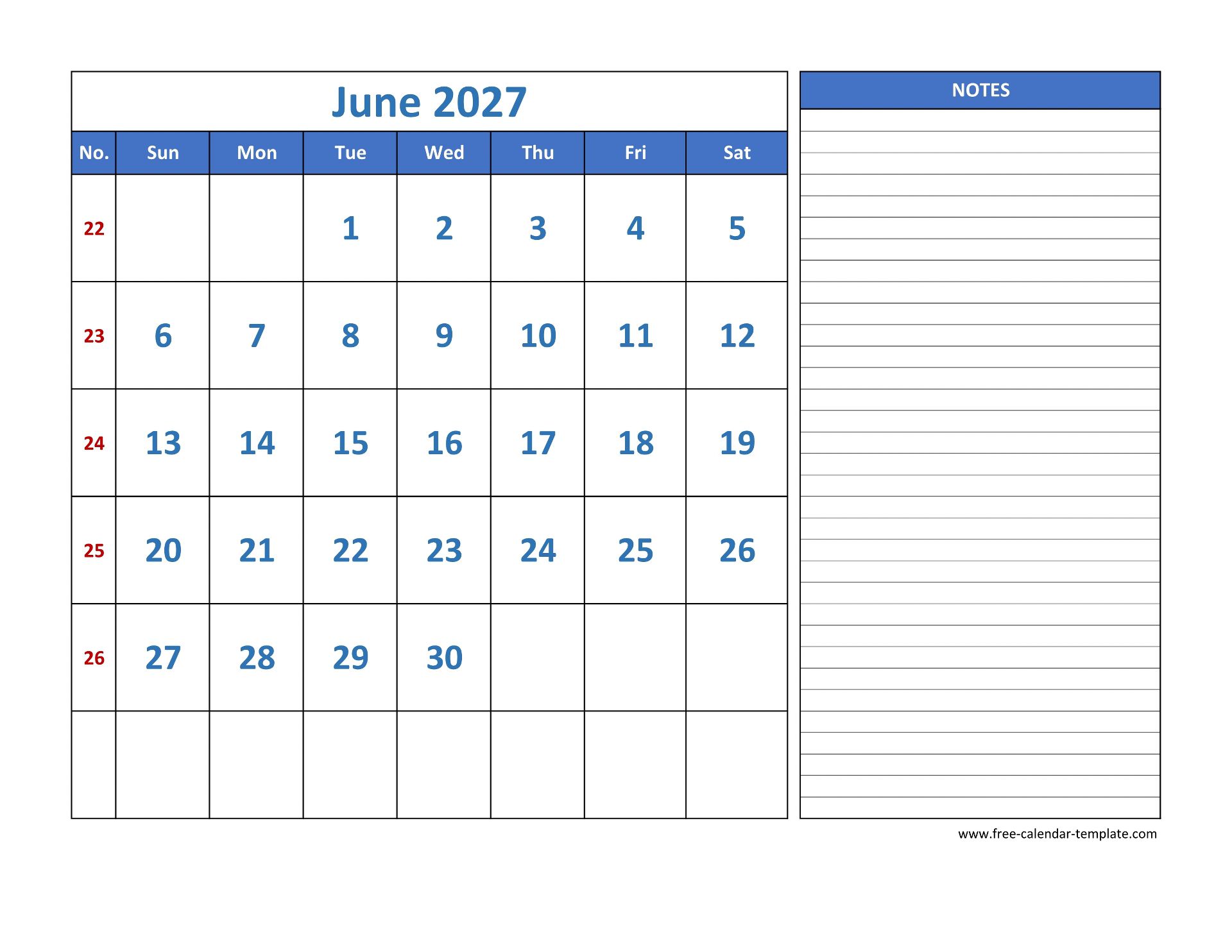 June Calendar 2027 with lines for notes