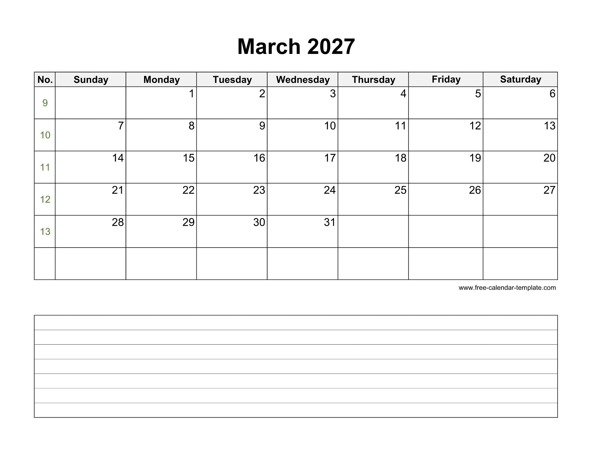 Free 2027 Calendar (Blank March Template)