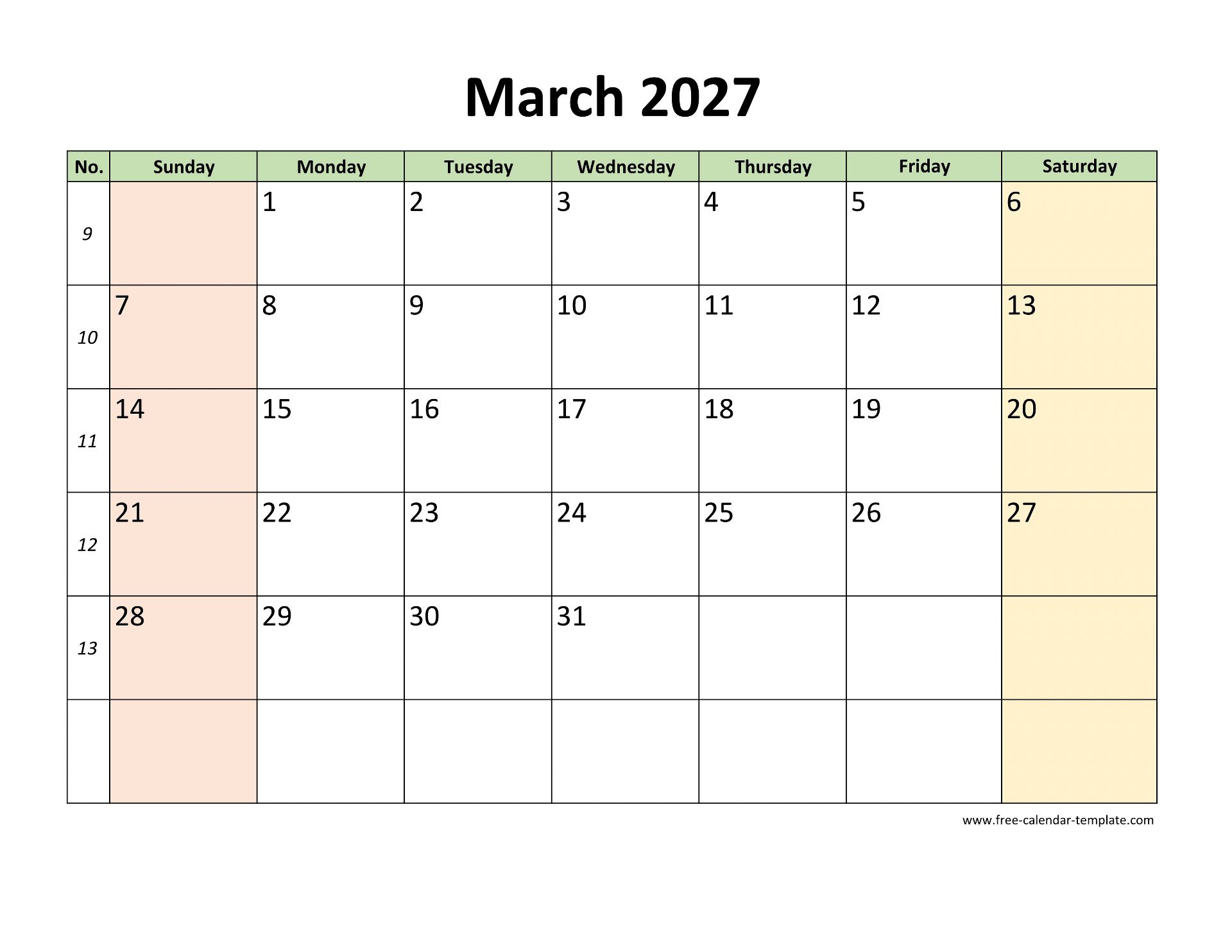 March 2027 Calendar Printable with coloring on weekend, large box on each day for notes. Free March 2027 Calendar Printable, week starts on Sunday, US letter format (horizontal layout), one month per page, 12 pages. Available in DOCX (MS Word), PDF (Adobe Reader PDF) and JPG. Free download and print, non-commercial use only.