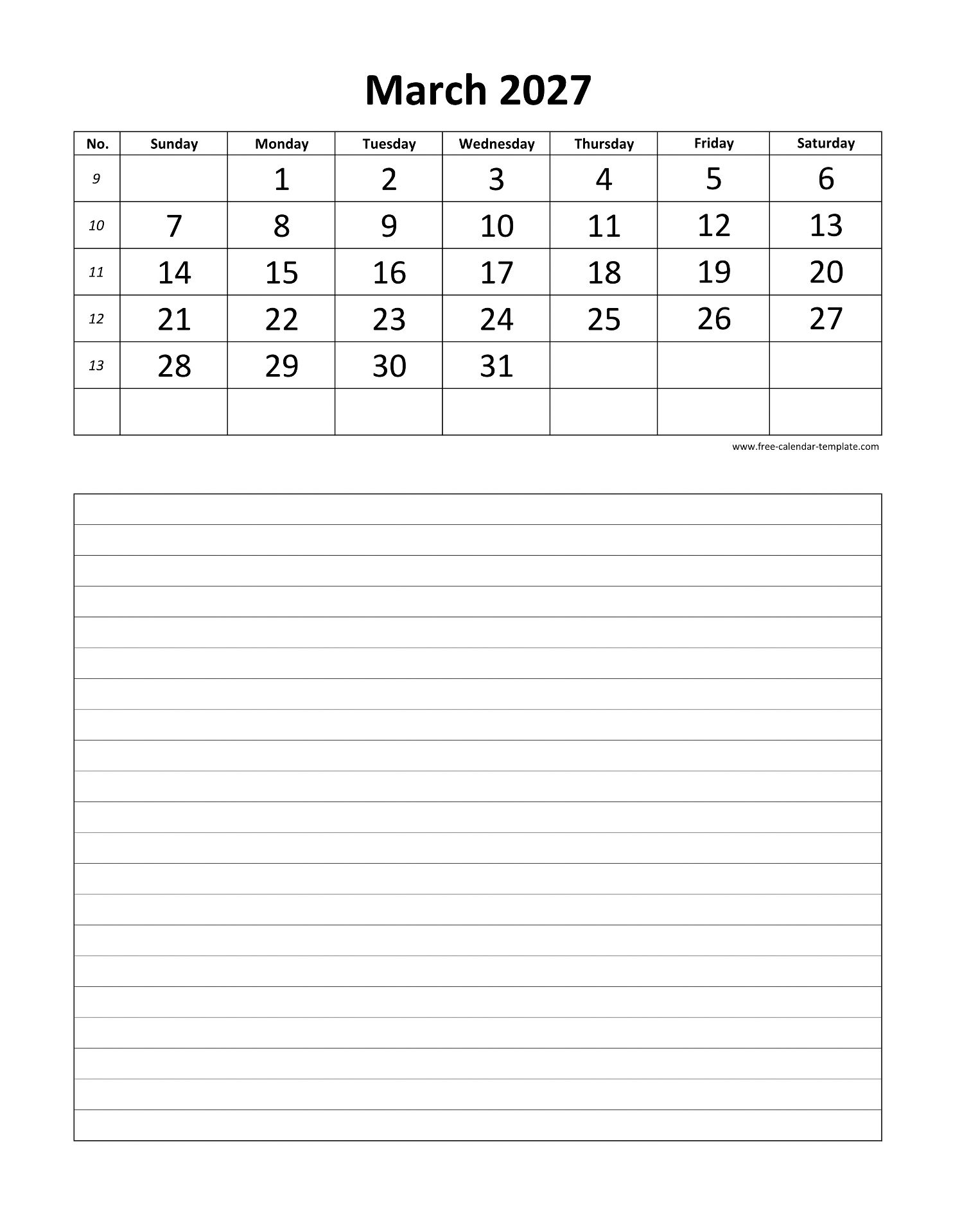 Printable 2027 March Calendar with grid lines for notes on the bottom for each day. Free Printable 2027 March Calendar, weeks starting on Sunday, US letter paper format (vertical layout), 12 months calendar on each page. Free download as DOCX (MS Word), PDF (Adobe Reader PDF) and JPG.