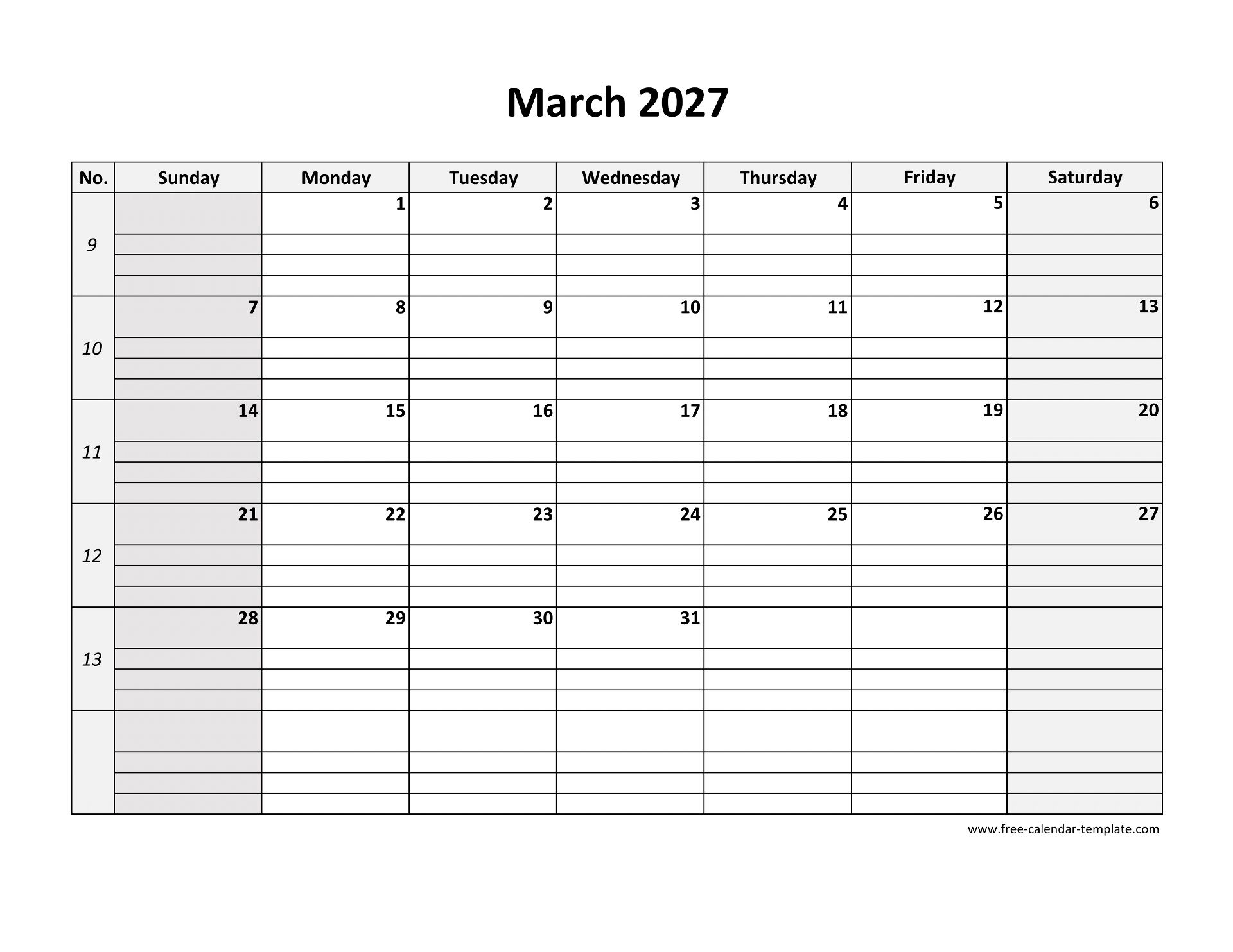 March Calendar 2027 grid lines for holidays and notes (horizontal)