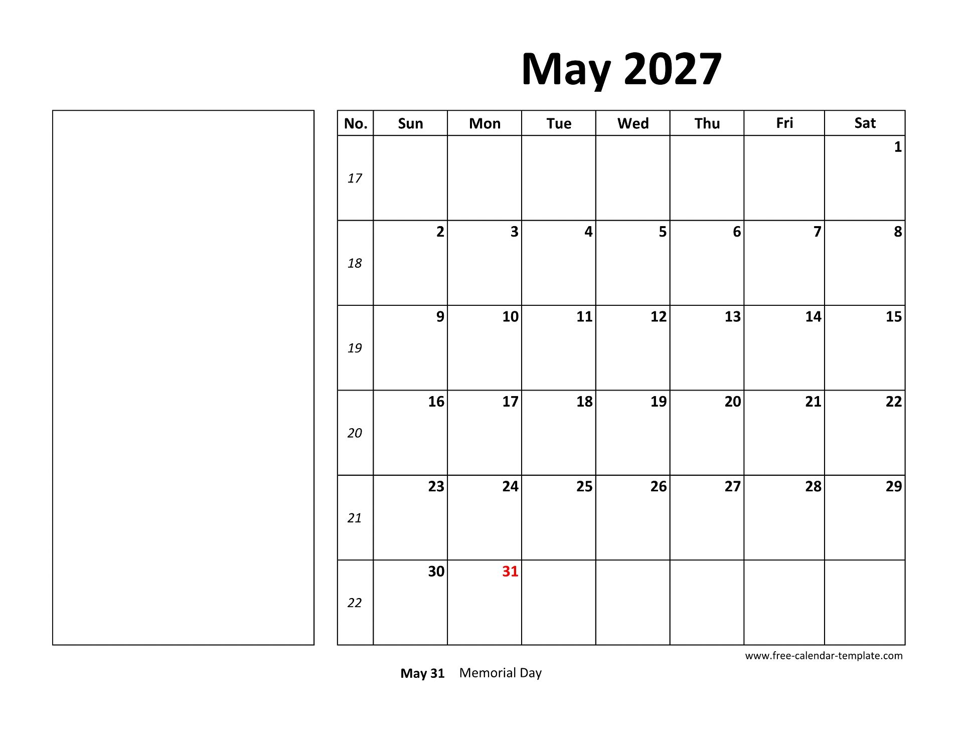 Printable May 2027 Calendar with holidays, week numbers, large box for each day and grid line for notes. Free Printable May 2027 Calendar, week starts on Sunday, US letter format (horizontal layout), one month calendar printed on each page. The available file formats are DOCX (MS Word), PDF (Adobe Reader PDF) and JPG. Free download and print at home or at work.