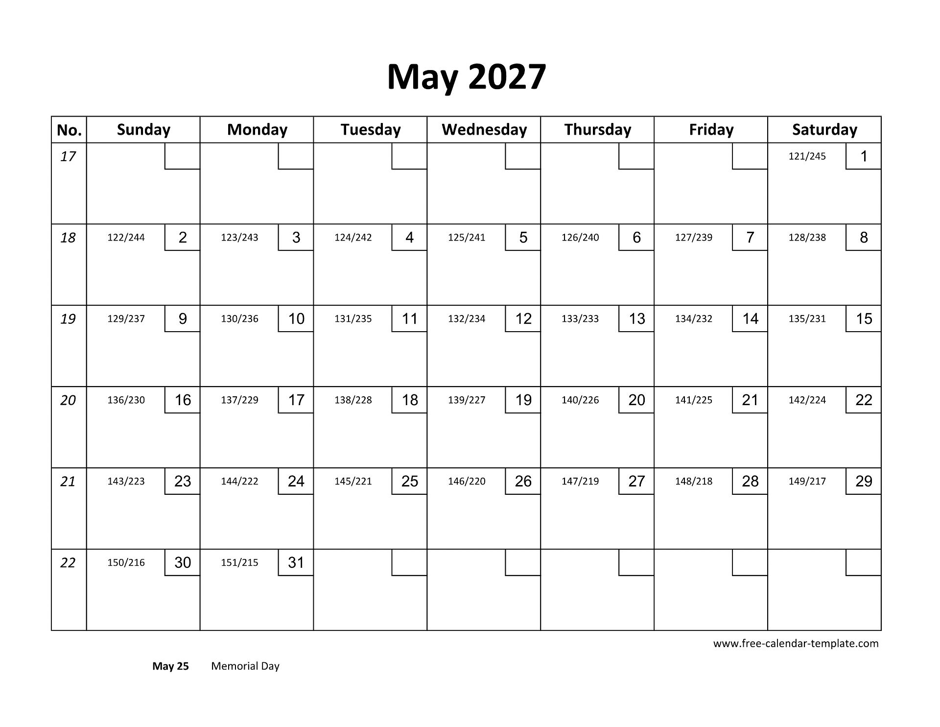 May Calendar 2027 grid lines for holidays and notes (horizontal)